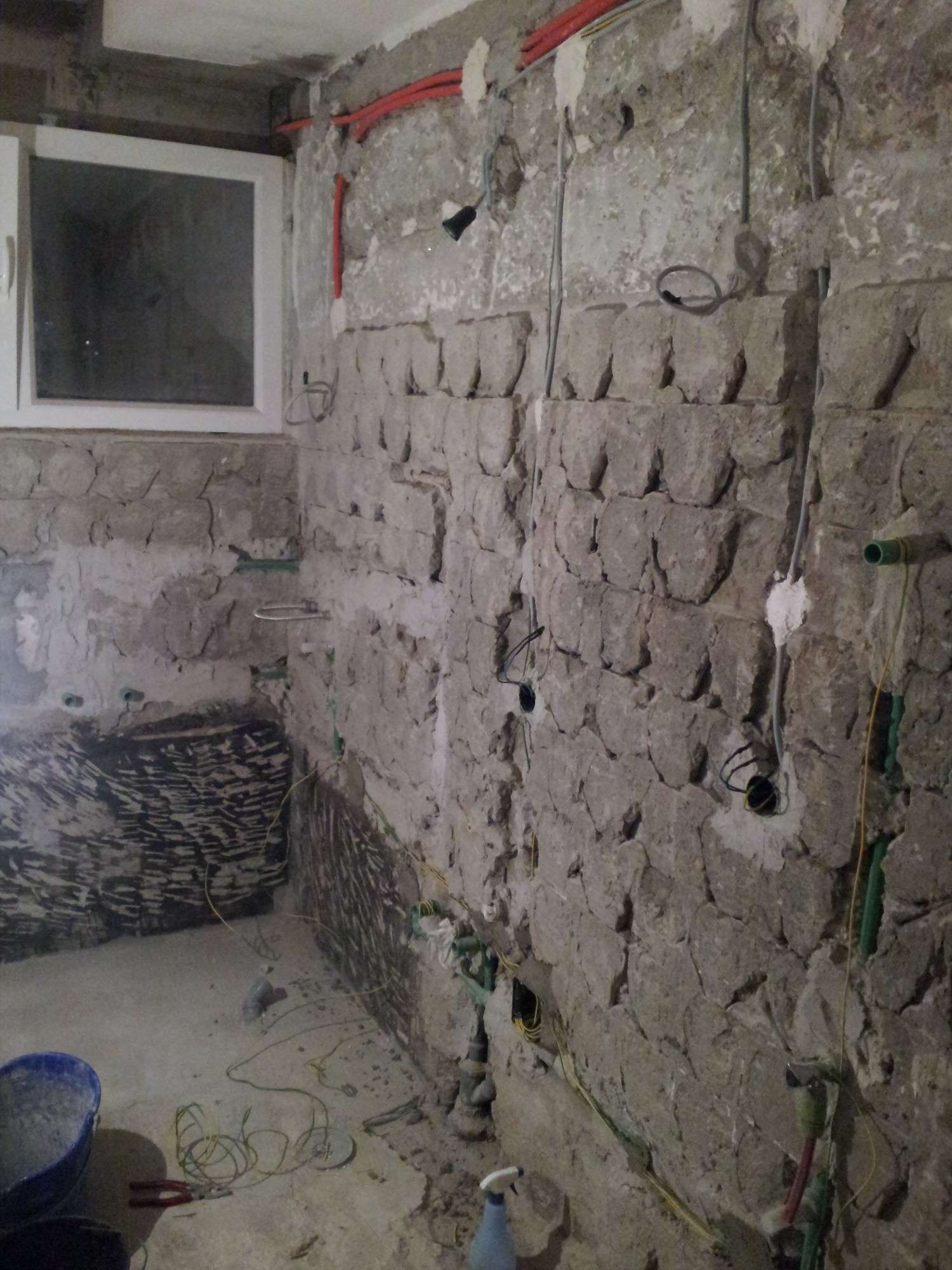 Stare instalacije u kupatilu su izvađene do zida sa špajzem, ali kanali ne bi mogli da se koriste pošto nisu urađeni po propisu kao što se i vidi na slici. Inače postojeća instalacija je katastrofalno urađena, kao što se vidi i na slici, a u kupatilo postoji čak i razvodna kutija. Da li neko zna od kada po propisima ne sme razvodna kutija da bude u kupatilu? Zgrada je završena 1980.godine, pa je možda to bilo po propisima.