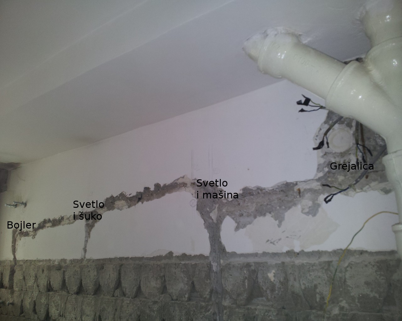 Kablove sam razvlačio na visini 20cm - 40cm od plafona, a između kablova sam ostavio oko 1-2cm da može da se uhvati malter. Spuštao sam ih vertikalno niz zid do mesta gde će biti priključak. Za svetlo sam koristio 3x1.5mm2 PPY kabl punog preseka (okrugli sivi), dok sam za ostatak koristio 3x2.5mm2. Izbacio sam razvodnu kutiju koja je postojala u kupatilu i sve razvukao do kutije ispred kupatila pošto u kupatilu po pravilu ne sme da bude kutija. Struja ne treba da se razvlači oko kade na 60cm udaljenosti, tako da sam šuko za brijač/fen stavio na odgovarajuću udaljenost. Šuko za fen i veš mašinu su na visini 110cm od poda, a šuko za grejalicu 30cm od plafona. Svetlo sam izveo na visinama 200cm i 180cm, a kabl za bojler na oko 150cm gde je bio i predhodni.