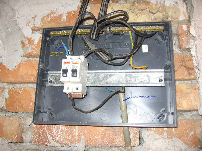 Na slici se vidi slede Dolazni kabl gde zuta zica (po nekom standardu uzemljenj ) vodi na most sa srafovima i crnu zicu (fazu koja ide na osigurac pa bakarnim cesljem na drugi osigurac) i trecu zicu plave boje koja nije nigde prikopcana ? e to me i buni ?