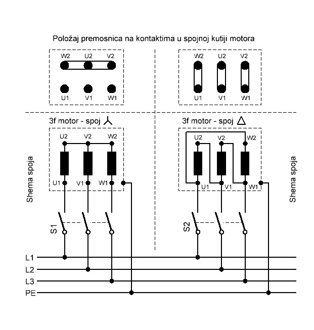 Ako nema veze između namotaja motora i limčića onda je zvezdište u motoru tako da na gornja tri izvoda dolaze tri faze. Prekidač bi trebao da bude tropolni od min 10A. Može i grebenasti prekidač u nekom kućištu.