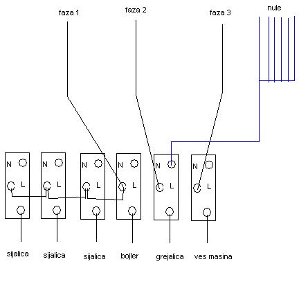Hvala na odgovoru. Koliko ja vidim u doznu prekidaca dolazi jedan petozilni kabl sa tri faze, nulom i uzemljenjem. Odatle na sijalice ide takodje petozilni kabl sa tri faze (za tri sijalice), nulom i uzemljenjem. Zatim ka tri potrosaca idu trozilni kablovi sa po fazom, nulom i uzemljenjem. U dozni su sve odlazne nule spojene sa dolazecom kao i uzemljenja a faze su rasporedjene kao na semi koju sam dao. Medjutim i dalje mi nije jasno kako bi trebalo da izgleda povezivanje da tinjalice rade ispravno. Mozete li mi nekako napraviti semu za ovaj deo instalacija? Nije mi jasno kako bi uopste trebalo da se poveze ovaj prekidac? Na semi, ako dobro razumem, trebalo bi da na N dovedem nulu a unutar njega tinjalica je dalje vezana na izlaz...