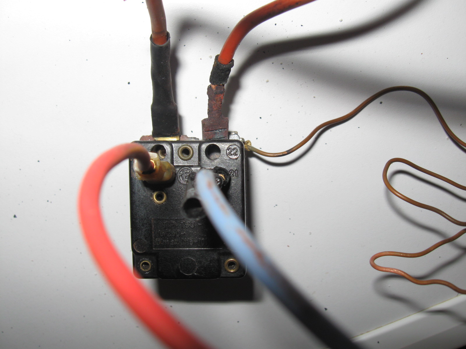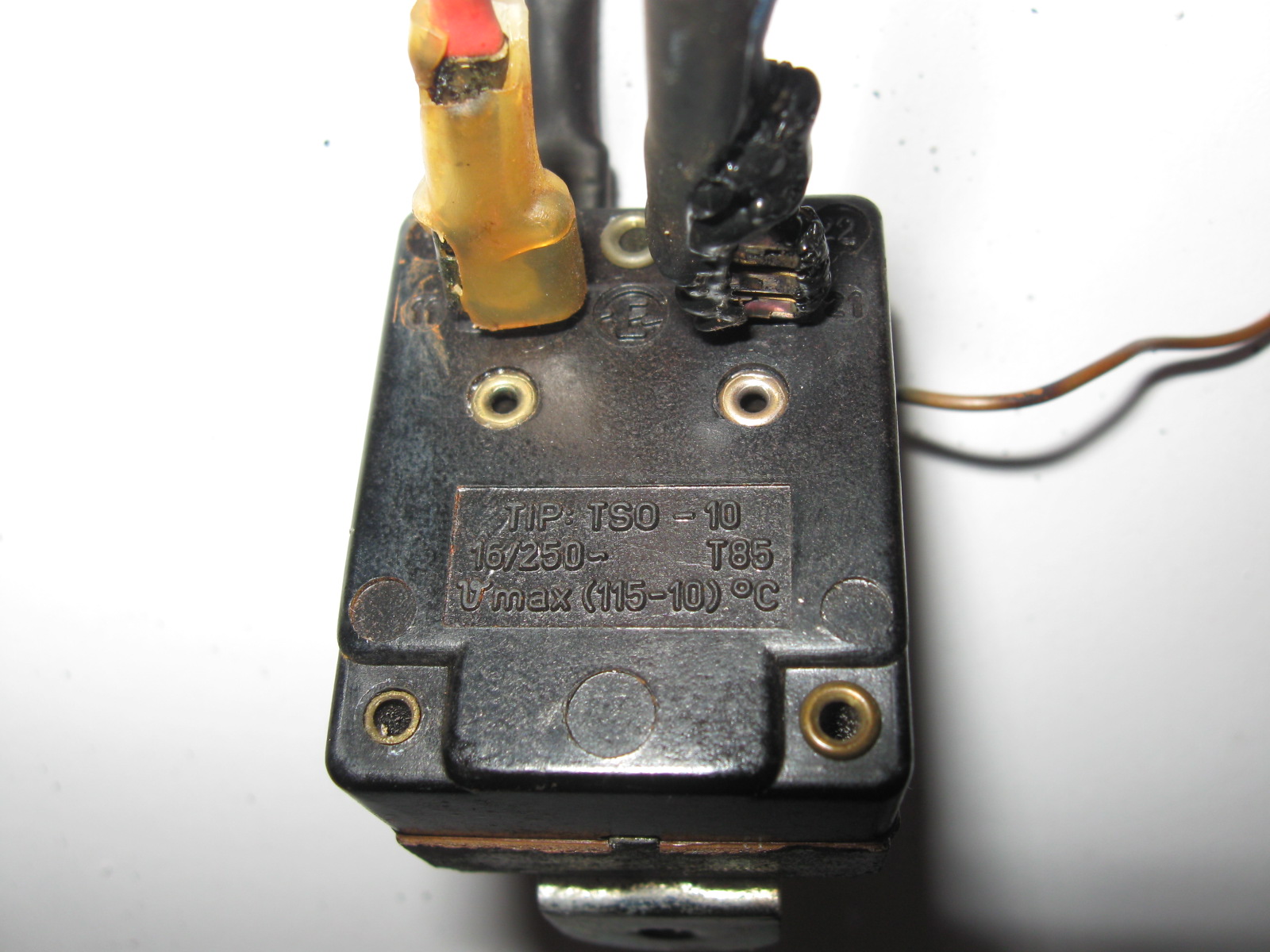 - Истопила се пластика на сигурносном термостату где је накачена плава жица. Чак се истопила/изгорела и термоскупљајућа пластика на букснама/стопицама.