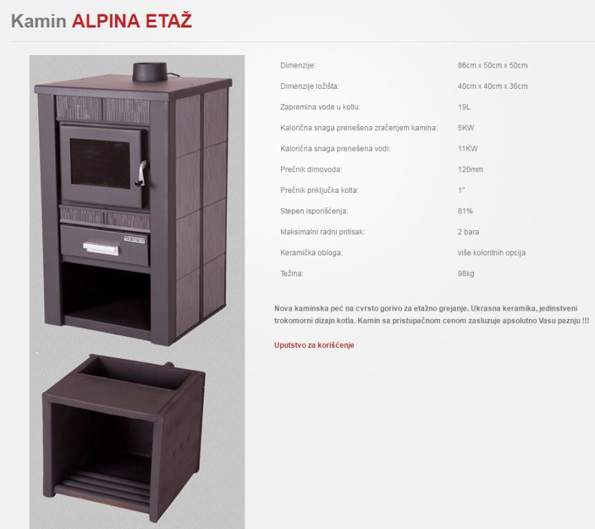 gledao sam po radnjama dosta tih kamina i kotlova i ono sto mi se okvirno uklapa u budzet i sto po mojim laickim procenam moze biti dovoljno dobar odabir je Pro-termo Alpina 30 kamin/kotao..proizvodjaca iz Stare Pazove..planirao sam da lozim samo drva, imam dimnjak u sobi koja je velicine 12 m2 i u toj sobi bi bio iskljucen radijator, dakle grubo 90m2 je prostor koji se treba grejati radijatorima, dakle 102 rebra cetvorokanalna su rasporedjena po kuci..