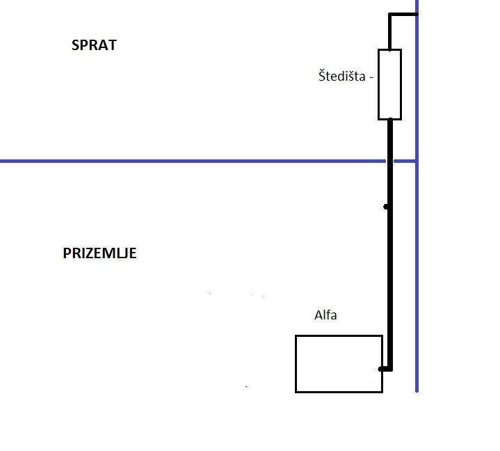 Pretraživajući forum naleteo sam na ovu temu. Naime, dole u prizemlju u dnevnoj sobi ložim alfin kamin i planirao sam da cevi sporvedem u sobu iznad (na spratu). Dnevna i ta soba na spratu koriste isti dimnjak, što znači da je alfin kamin tačno ispod otvora za dimnjak i u prizemlju i na spratu. Rupu u ploči imam od pre, jer je to davno planirano. Znači hteo bih da ložim dole kao i obično, a da gore sprovedem cev i na cev nakačim štedišu sa kojim bih grejao sobu. Zanima me koliko je to izvodljivo? Mislim fizički jeste, to znam, ali kad se uzme u obzir da se alfin kamin dole loži pošteno (bude i do 30 stepeni u prizemlju), pali se rano ujutru, a gasi kasno u noć. Soba koju bih grejao površine je oko 16-17 kvadrata. Prema vašem iskustvu, da li postoji šansa da tokom zimskih dana gore na spratu bude neka prijatna temperatura? Skicirao sam (izvinajvam se na kvalitetu), ali čisto da imate predstavu. Hvala unapred.