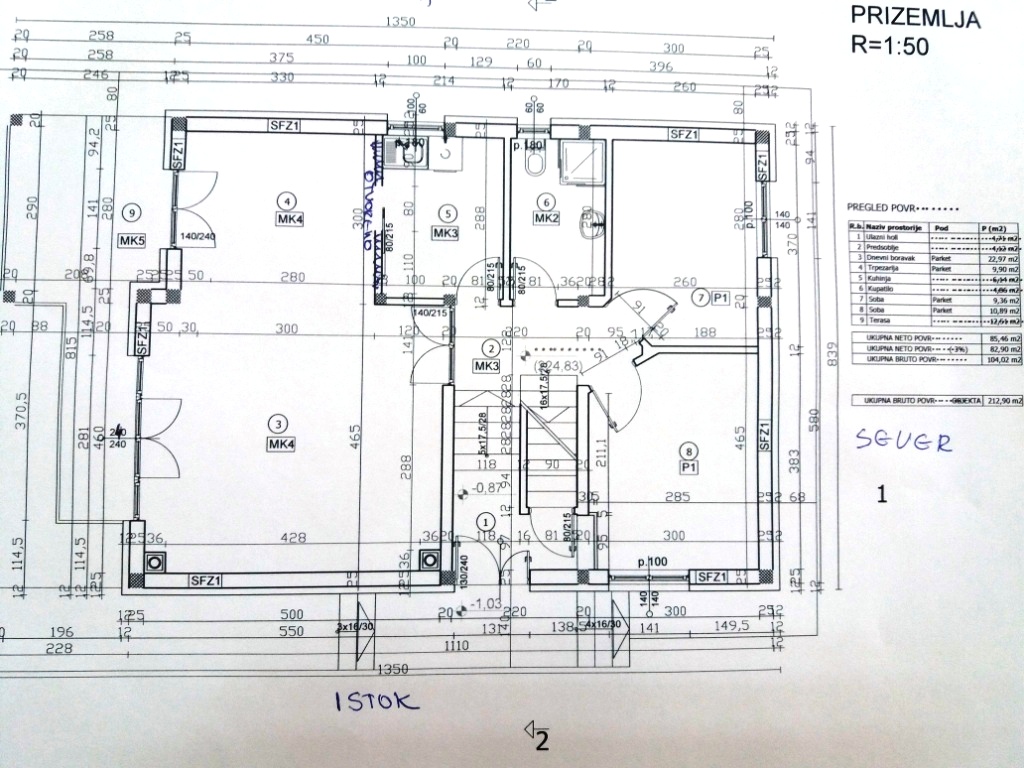 Hvala na odgovorima Mladenu u Grejacu. Evo prikacio sam plan prizemelja sa oznacenim stranama sveta, zidano je zidarskim blokom, izolacija je 10cm stiropora, ispod 1,3,4 i pola 5 je podrum, na plafonu podruma je 3cm stiropora a ispod kosuljice je 2cm stirodura, prostorije 2,3 i 4 su sa parketom dok su 7 i 8 laminat, 1i 5 plocice. Iznad prizemlja je sprat koji se za sada ne koristi ali je u planu, to je jos nekih 60m2 maksimalno, s tim sto je deo u kosinama. Ulaz 1, 2 hodnik i stepnice koje vode ka spratu su otvorene (ovde se ne vide) i gore je hodnik za sprat koji ne mogu da zatvorim dok cu vrata na gornjim sobama da zatvorim tako da toplota iz hodnika ne ide ka sobama vec samo po hodniku. Iznad ploce na spratu je 10cm vune. Dosadasnji proracuni majstora samo za prizemelje (po spratu za sada necu da razvodim instalacije i stavljam radijatore) su oko 15Kw radijatora, sa hodnikom i podestom izmedju spratova, sta vi mislite o tome?U glavnom projektu za kucu su stavili da je ukupan gubitak oko 3kw, doduse predvideli su 12cm stiropora i prema tome da mi treba za celu kucu 19Kw radijatora a predviđen gasni kotao od 24Kw, panelni radijatori Merosina (možda ovo i nije toliko bitno pa zanemarite). Eto, probao sam malo detaljnije da opisem situaciju pa ako neko ima vremena nek baci pogled i da misljenje.