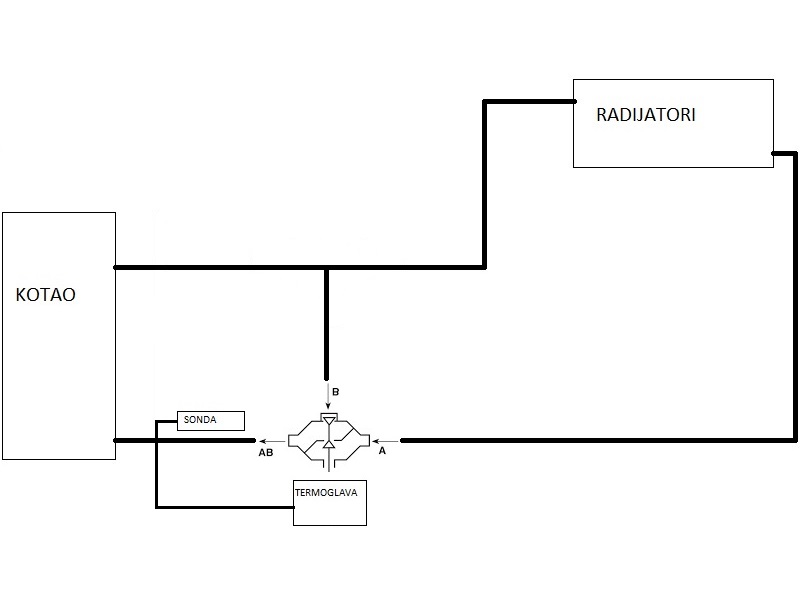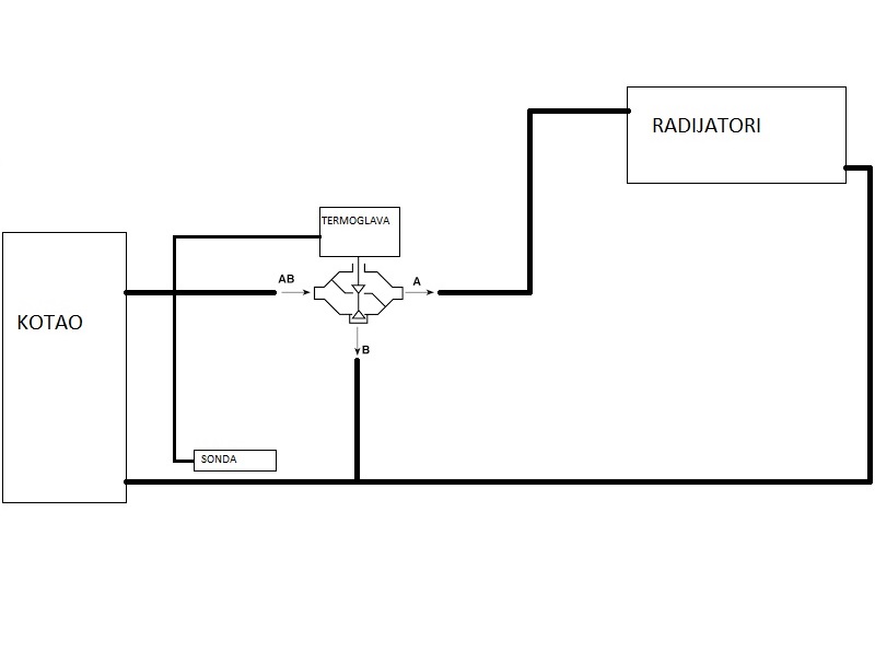 Prvo moras da razumes za sta se taj ventil u ovom slucaju koristi. Koristi se da obezbedi da povratna temperatura u kotao bude na odredjenoj vrednosti. Npr 60C. I tada iz A ide ka AB a B je zatvoren, dok god termo glava ne krene da gura na odredjenoj temperaturi. I tada se vrsi samo cirkulacija izmedju A i AB. Sonda se postavi na povrat ka kotlu. Kada njena temperatura dostigne npr 60C Termoglava gura telo ventila i distribuira temperaturi ka izlazu/ulazu B, i vrsi crkulaciju kroz sistem grejanja.
