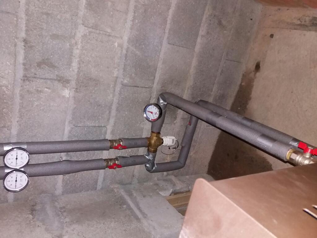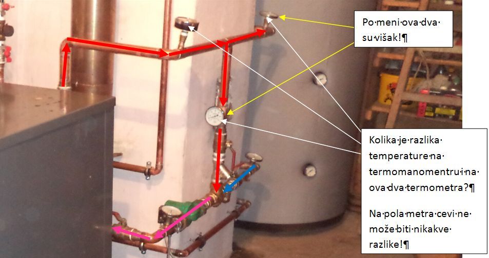 To je povezano na kotao koji se loži drvima , i u konkretnom slučaju pri puštanju u pogon i nakon odvazdušivanja i uključenja pumpe i svega stvorio se vazdušni čep, i na osnovu tih 5 termometara smo uvideli da nešto ne valja jer nije voda išla kako bi trebalo, al posle par minuta brige je najzad probilo čep i proradilo. Obzirom da su oko 350 din stavljeni su na svaku granu da se može pratiti t vode , onaj u sredini gleda ka ulazu u kotlarnicu a što je stavljen već se ne sećam . A obzirom da se radi o trokrakom mešnom gotovo je sigurno da ni na jednoj grani nije ista t vode, uvek ima male razlike. Npr prvi ide iz kotla i pokazuje 80, taj u sredini može da ide do 61 , onaj ka buferu pokazuje koliko je ostalo od ova dva jer nešto vraća u kotao a ostatak gura u bufer, onaj na povratu iz bufera pokazuje koliko dolazi ka mešnom , tamo je uvek najmanje dok se ne ugreje bufer skroz, al i onda je manje, i naravno povrat u kotao koji bi trebao da pokazuje bar onih 61 kad se malo zagreje .