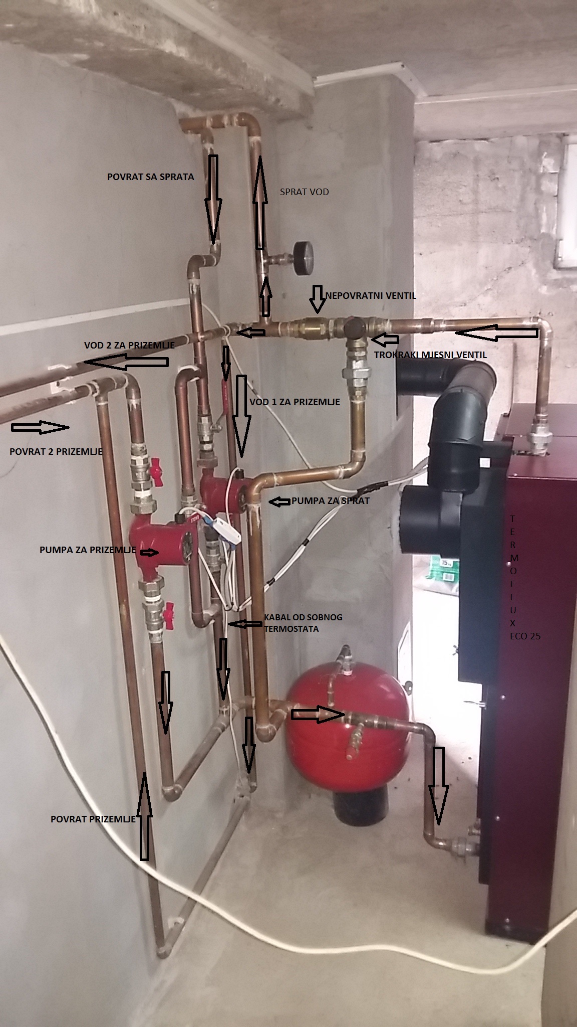 Imao bi samo jos jedno pitanje. Sobni termostat koji se nalazi u prizemlju upravlja radom obadvije pumpe, kada postigne zadanu T gasi pumpe, kotao radi do zadane T i gasi se i on. E sad, posto veci dio dana na spratu nema niko, a sprat je i topliji od prizemlja pa kada je dole normalana temperatura gore je pretoplo, ugradio bi jos jedan sobni termostat na drugu pumpu za gornji sprat. Interesuje me jeli to izvodljivo i sta bih trebao uraditi na instalaciji da to funkcionise, posto vidim da su pumpe na istom potisnom vodu i kada bi radila samo pumpa za prizemlje dali bi slala toplu vodu i na sprat. Nekako bi to da odvojim sobnim termostatom, unaprijed hvala!