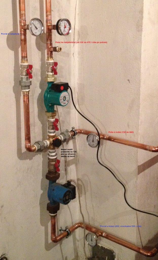 Npravite sistem sličan ovome sa fotografije u prilogu. Nije bitno gde će biti pumpa u kotlovskom krugu na povratnoj cevi. S obzirom da nemate nikakvu automatiku onda neka sobni termostat preko dodatnog relea uključuje kotlovsku pumpu u isto vreme kad i gorionik i radijatorsku pumpu. U radijatore će ići oko 47C ako postavite mešni ventil kao što je na fotografiji.