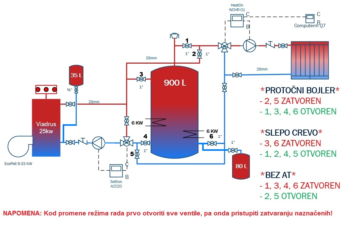 Evo šeme kompletnog rešenja za sve režime rada grejnog sistema sa akumulatorom toplote od 900 litara