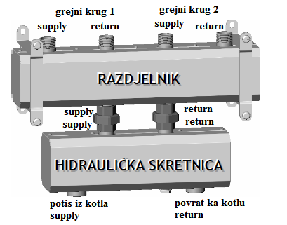 Supply - potis, Return - povrat, i tako treba spojiti potisnu cev iz kotla na HS, pa onda HS na razdelnik, pa razdelnik na greje krugove. A povrat na povrat, iz grejnih krugova na razdelnik (u povratu se to zove sabirnik), pa sa sabirnika na ulazni povrat HS, pa sa izlaznog povrta HS na povrat kotla.