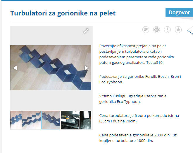 Ево за Змајдина, знам да је он стручњак за турбулаторе. Како вам се ови чине по свом облику за Ферроли СФЛ6 ? А и каква је цена? Хтео бих да позовем да ми ставе трубулаторе и да ми наштелују горионик П12. Да ми спусте најниже што могу свих 5 нивоа снаге у зависности од сагоревања и температуре димних гасова.