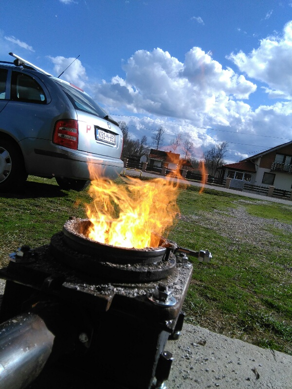 Nisam više izdržao a da ne potpalim novi gorionik. Većina stvari je improvizovana ali suštinu sam otprilike sagledao. Lijepo se razvija plamen, odnos primar-sekundar malo ću korigovati a bez problema poteže 30 i koji kw više. Vjetar mi je skratio uživanje ali ovo što sam vidio- zadovoljan sam. Slede korekcije, završetak dozatora za košticu šljive a onda pakovanje u ložište kotla