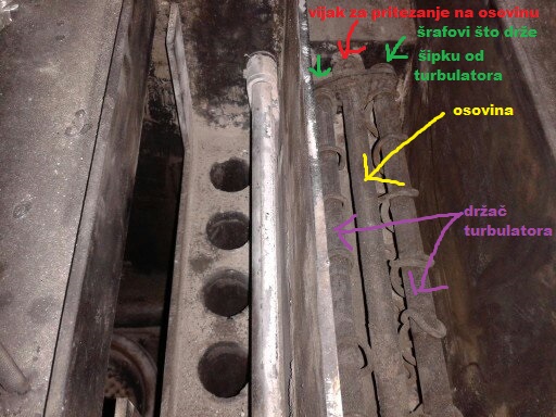 evo par slika, meni su turbulatori još žičani, pa sam ja ubacivao flah smotan u spiralu, u prvoj komori sam ostavio a u drugoj sam skinuo jer je bilo teško i malo je kočilo protok vazduha.