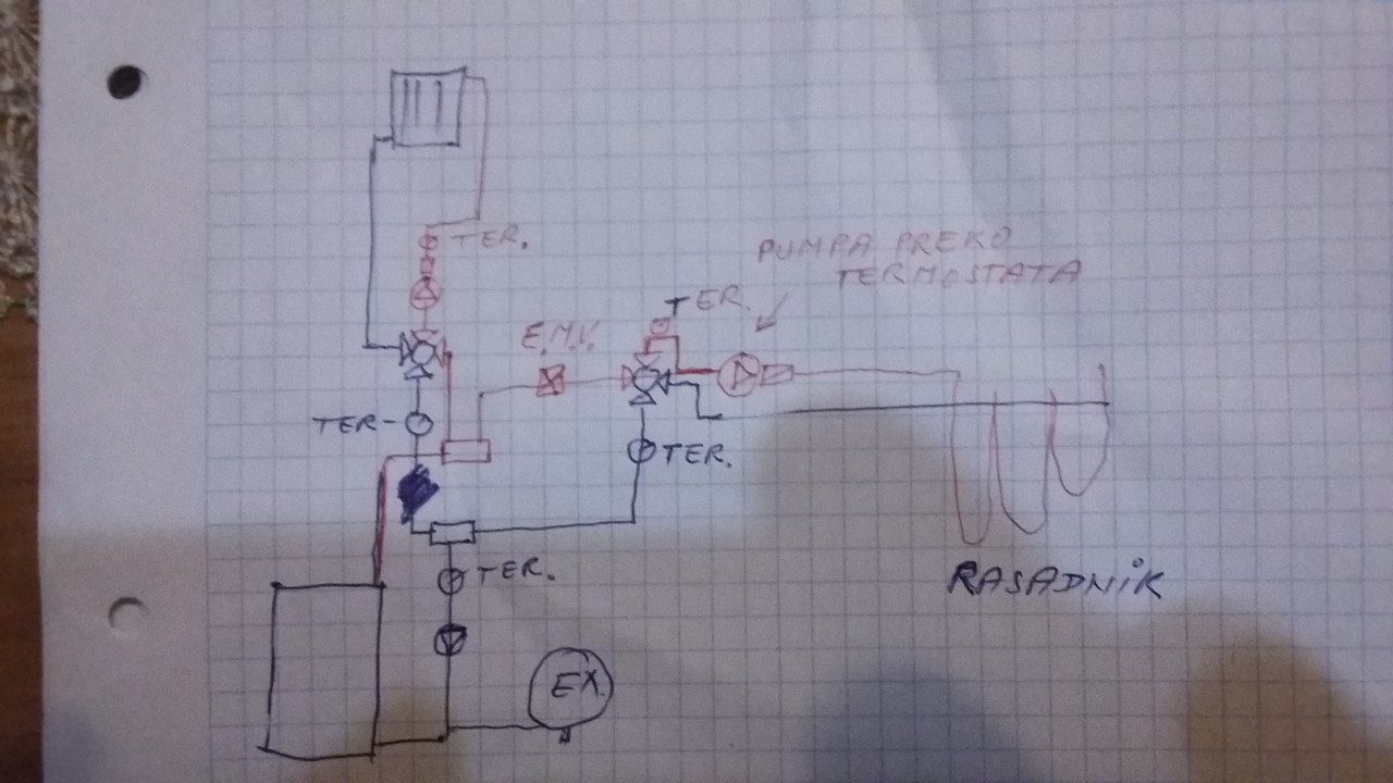 Oba četverokraka ventila bi regulisala temperaturu jedan u radijatere a drugi u rasadnik recimo 50* a istovremeno recimo povrat sa oba ventila bi bio mislim preko 60. Pošto termostat iz rasadnika pali pumpu od rasadnika svakih odprilike pola sata tu bi sigurno dolazilo malo do poremećaja svih regulacija ali to traje desetak min pa opet stabilizacija. Pumpa od rasadnika više vremena miruje nego što radi. Sad potis iz mešnog se račva T ka radijatorima i ka rasadniku a povrat radijatora i rasadnika se spajaju u T račvu pred ulazom povrat u mešni.