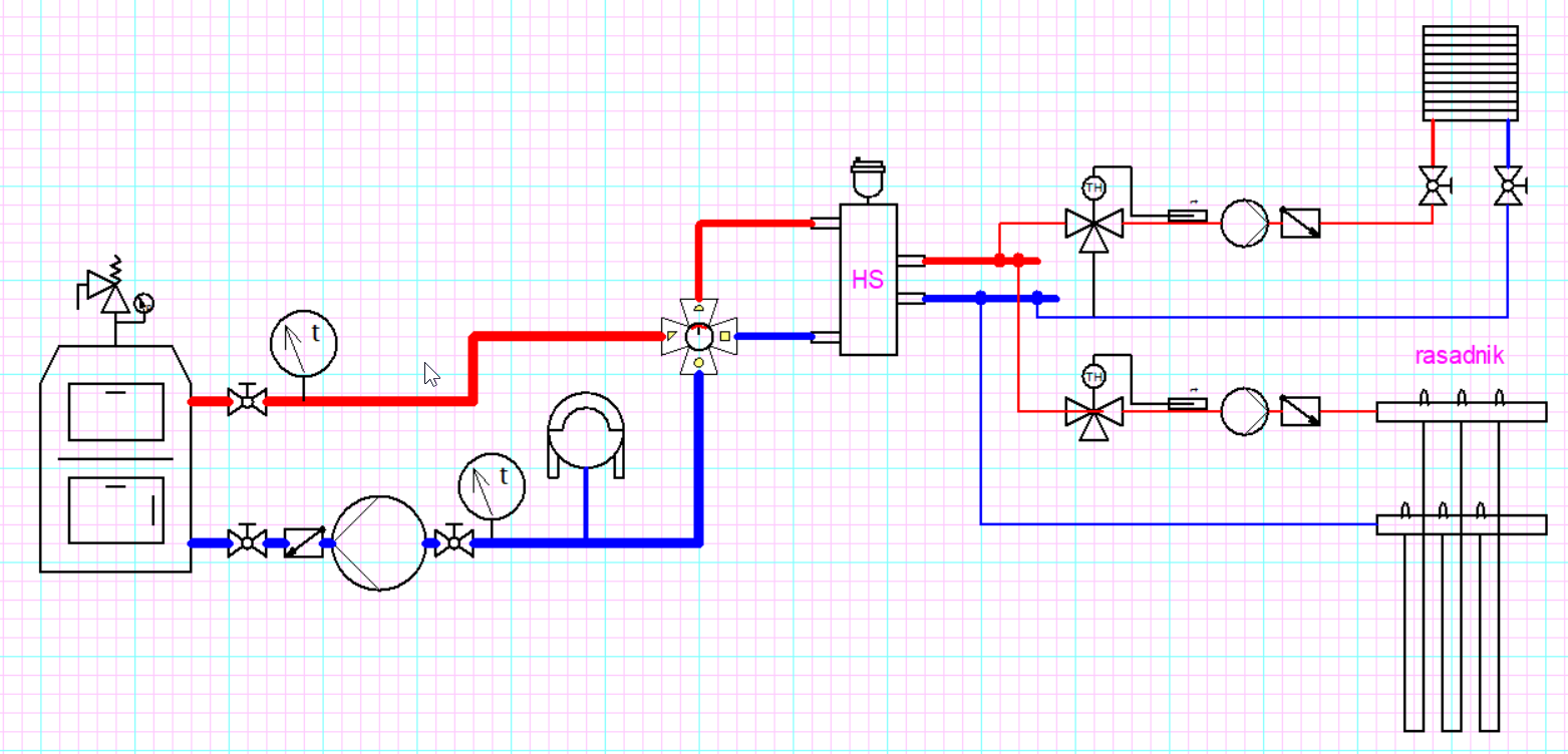 E sad par pitanja. Što si stavio četvorokrake u potrošačke krugove a nijedan u kotlovski (a sad ga imaš), da li oni treba da regulišu polazne temperature ka radijatorima i rasadniku?