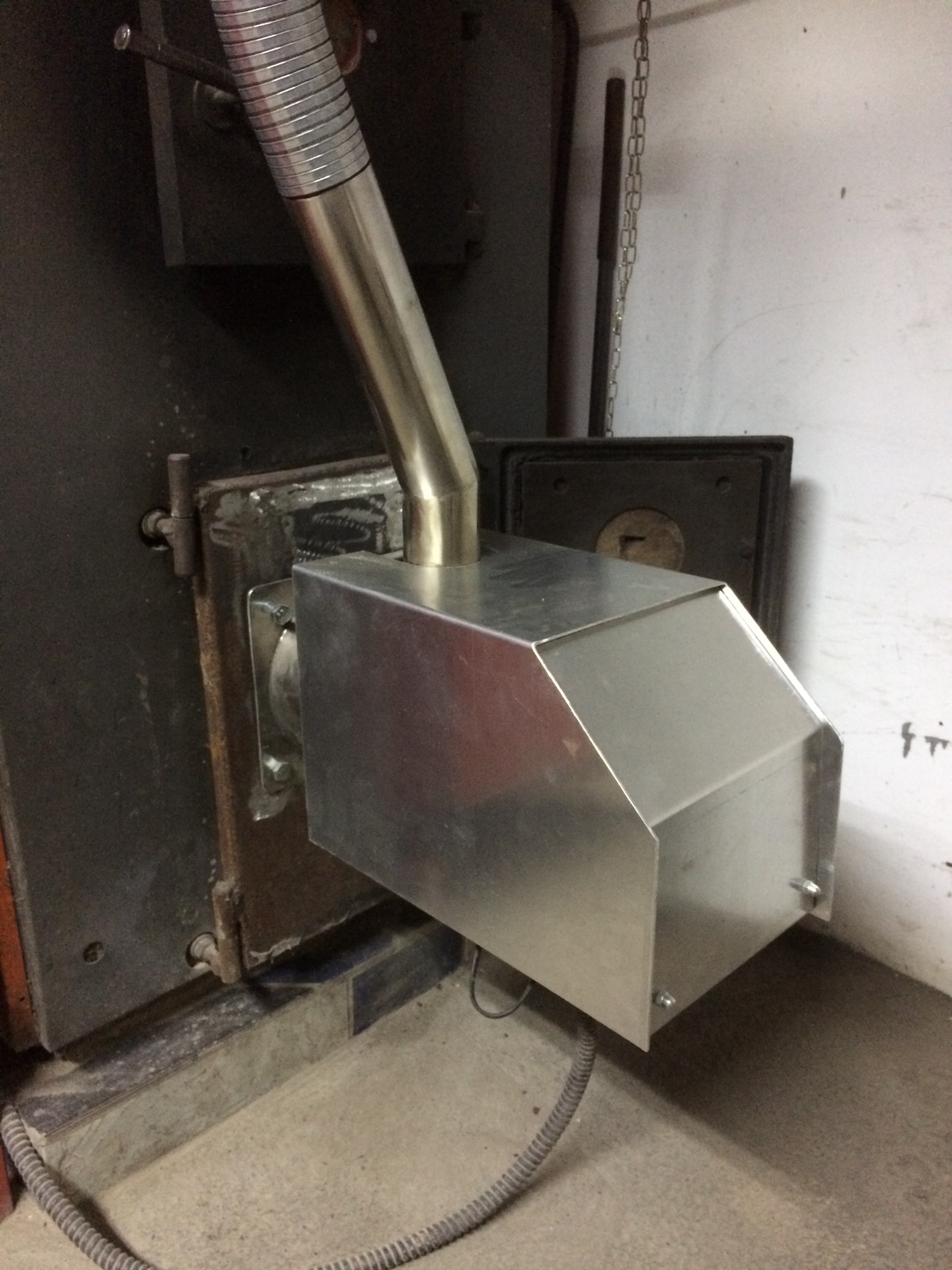ventilator je od gorionika za naftu a motor je mali trofazni oko 100W, motor elevatora je previše jak a i glomazan za ovakvo nešto