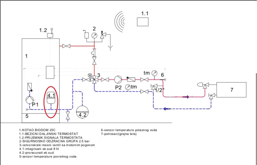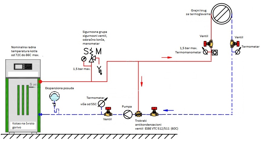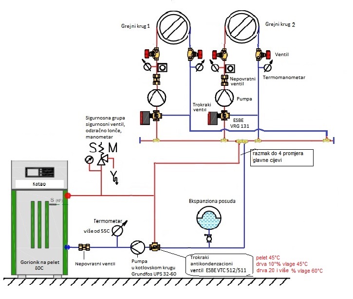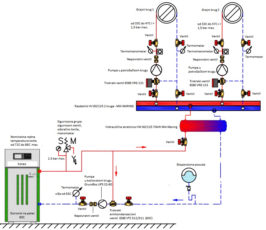 U prilogu je i jedna šema pravilno izvedene hidraulične instalacije za dva grejna kruga, kao i ispravno setovane sve radne temperature i pritisak u sistemu.