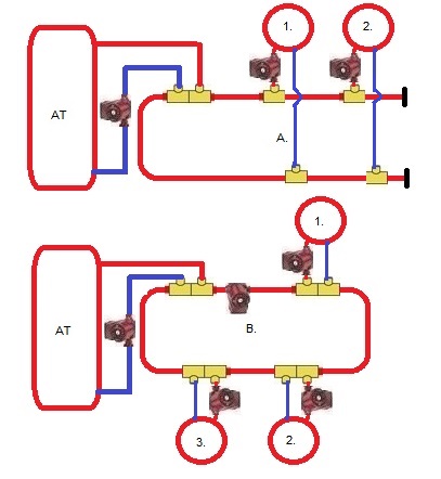 Ventili za regulaciju mora biti ispred pumpe kruga grijanja, pumpa je veća i može biti bilo gdje, što je dalje ventil to veći gubitak energiju u cijevi koja je topla, veća razlika temperature cijevi i okoline. Ventili bliže kotlu pumpe dalje to je dobro. U prostoru oko kotla na nekoliko metara nije veliki gubitak, kotao i dimnjak ili cijev do dimnjaka griju prostor.