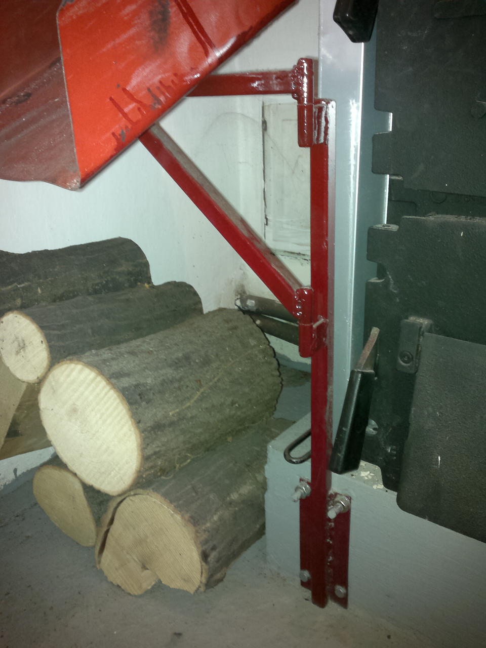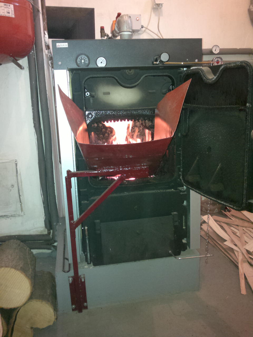 Sto se tice lozenja i ja sam imao slican problem pa sam nesto iskonstruisao ako ti sta vredi ovo sa slike. Kada otvorim vrata od kotla "ono crveno" sa leve strane "gurnem-povucem" u u to sipam ugalj a on niz kosinu uleti u loziste.