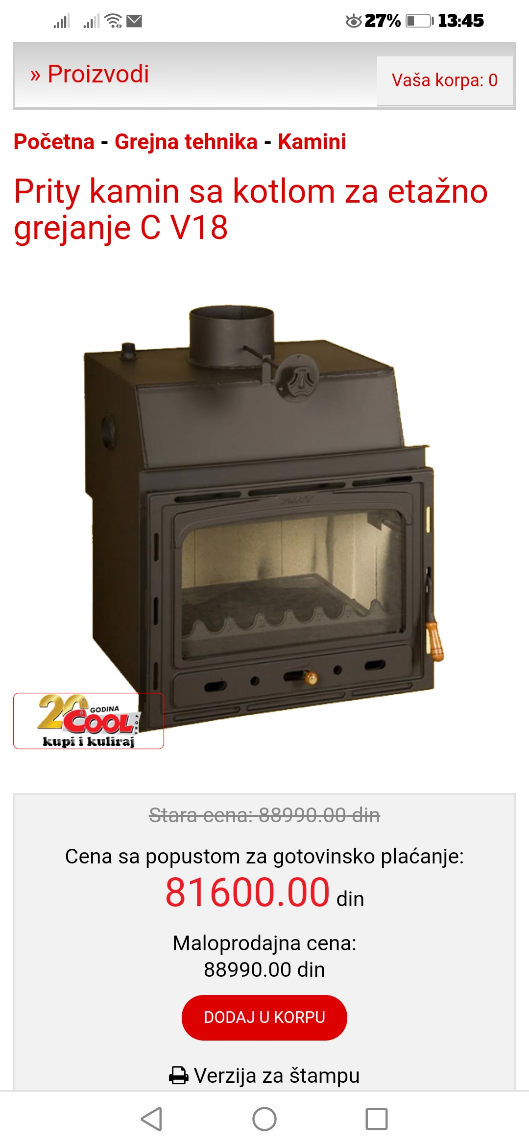 Zar cw 18 nije vec predvidjen za centralno grejanje? Ako je to ovaj kamin- https://www.pazaruvaj.com/kamini-c4177/prity/cw18-p81554929/ https://www.mall.hr/kamini-drva/prity-kamin-za-ugradnju-cw-18 Koliku kvadraturu grejete, opisite malo detaljnije objekat i kako je izvedena instalacija.