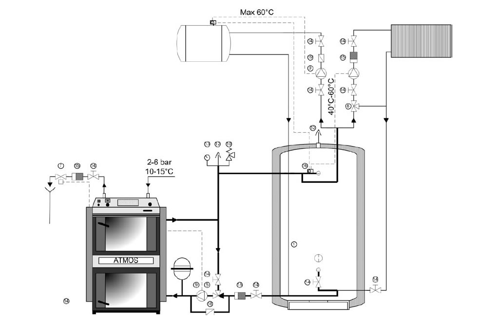 Ja sa uradio slično, kako je odgovor "tihi2". Glede povezivanja: imam Attak kotao , uplinjevali DPX 25; zalogovnik-spremnikakumulator je 3600l i u njemu je inox bojler za sanitarnu vodu. Najprije ogrejem akumulator ; to je jedan krog hidraulične vezave; imam na peči laddomat za upravlajnje vezave peč-zalogovnik, patrona je 65°C.