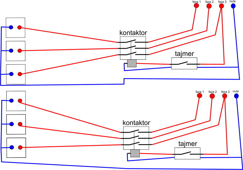 Hvala za semu. Dovoljne su dve pumpe. Jedna za vezu kotao cisterna i jedna za vezu izmenjivac kuca. Samo mi jos nije jasno kako da povezem termoregulator sa sklopkom? I da li moze jedan tajmer i jedan termoregulator za dva kontaktora?