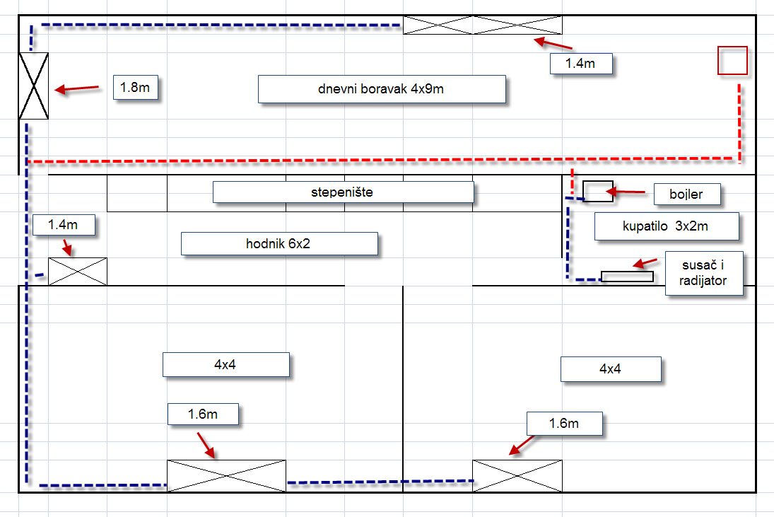 na šemi je prikazan raspored-crvena isprekidana instalacija u garaži, plava isprekidana instalacija u kući.
