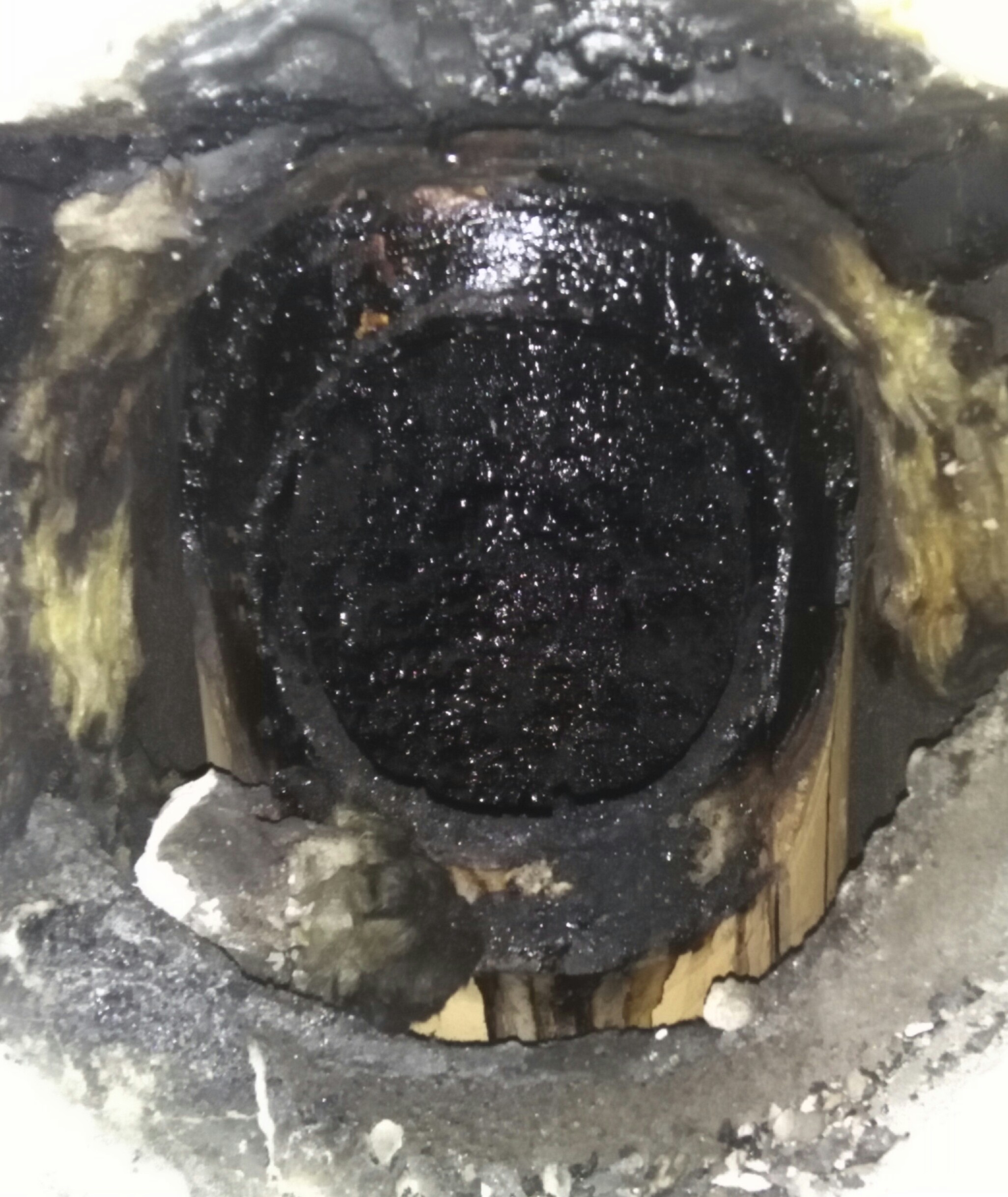 Jadini uzrok kondenzaciji je pothlađenost odnosno snižavanje temperature dimn ih gasova ispod tačke rošenja. Znači trebalo bi proveriti da li je izolacija urađena čitavom visinom dimnjaka. Iz odgovara mi nije jasno da li na jednom dimnjaku ima jedan ili više priključaka za peći/kotlove? Deo koji je otpao mi deluje kao posledica neke mehaničke sile ... kao da je neravnomerno sleganje cevi dimnjaka i ostalih delova građevine ... Da li vuna koja se vidi na slici postoji oko svih cevi ili samo oko priključka?