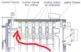 I ja sam ludeo prilikom izbora kotla i stalno se predomisljao pa sam na kraju uzeo U22 zbog pristupacnosti, trajnosti u odnosu na celicne kotlove koji se sada nude kod nas i jednostavnosti. Potrosnja ti zavisi od mnogo mnogo faktora ne samo od samog kotla. Bitan je i dimnjak, kvalitet ogreva, izolacija objekta, navike ukucana (koliko bi da im bude toplo, da li i nocu da bude toplo...) itd. E sad se svi hvataju za to vidi se otvor za dimnjak kroz vrata, ALI tu nije situacija da se dim i vatra izdizu se i ulazie pravo u dimnjak ili nesto slicno... Dole na slici pogledaj putanju dima ja sam je malo ''strucno'' pojacao crvenom strelicom da se bolje uoci. Dim skrece prema vratima ,a zatim se zavija od vrata i krece se prema dimnjaku prolazeci kroz komoru koja kao i skoro celo telo kotla prenosi toplotu na vodu... Sa U24 nisam upoznat ,a bio mi je nezanimljiv zbog cene ali sam cuo da je dobar. Imas ovde na forumu kao sto rece grejac opsirne teme o U24