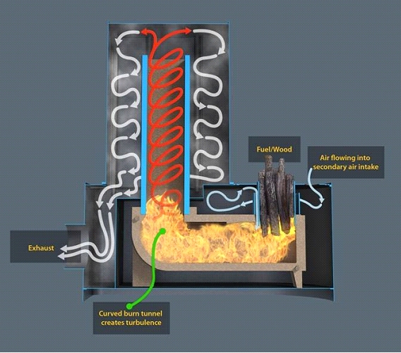 ventil pa stvar ti je jednostavna, i efikasna. Ne stavljaš kotao za vodu već napraviš spiralu od bakrene cijevi. Ako si pogledao slike raketne peći koju su napravili kod vas, na jednoj slici ćeš primjetiti skoro gotovu raketnu peć bez ploče za kuhanje. Tu vidiš dvije kockaste rupe. Taj isti princip sam koristio i ja kod svoje. To su dvije "cijevi". Prva cijev, heatriser (koji je i ovdje promjera dimnjaka) je spojena s ložištem i služi za dizanje toplog zraka i stvaranje podtlaka u ložištu. Kad gore staviš ploču za kuhanje vreli zrak, plamen udara o ploču i omogućava kuhanje. zatim se odbija od ploče i prolazi ovom hladnijom cijevi do dna i dalje u dimovodnu cijev. Ako bakrenu spiralu postaviš uz stijenke te druge cijevi dobit ćeš efikasno zagrijavaje medija koji teče kroz tu spiralu, bez neke opasnosti da spirala pregori., pa ako to spojiš sa sustavom radijatora dobivaš centralno grijanje. Ono, samo tako, bez nekih filozofija, umovanja, znanosti.