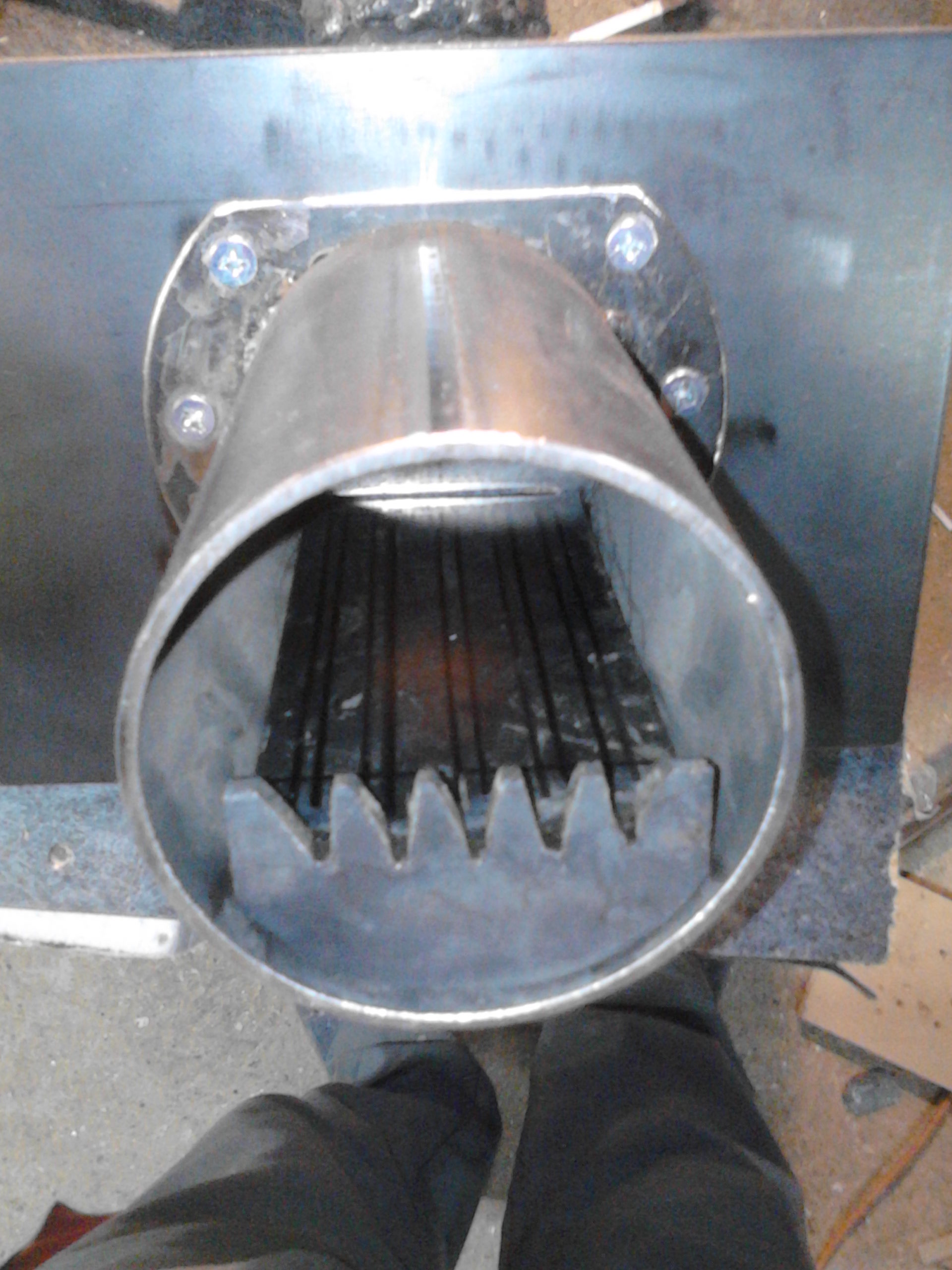 Hvala dusanmijat na dobronamernim komentarima. Mrežica je na izlazu vazduha ispod rešetke da se kod čišćenja neki pelet nebi zavukao gde ne treba a što se te ploče tiče, to će biti vrata a tubus planiram odvojiti i izoliratu da ne bi grejao vrata... nego još trebam nabaviti ventilator, foto-ćeliju i elektroniku. Problem mi je vraćanja plamena u punjač što je, verujem, zbog odnosa primarnog i sekundarnog vazduha ili grešim? Evo i slika... Pozdrav