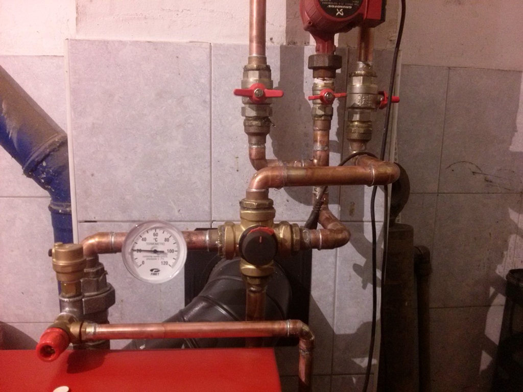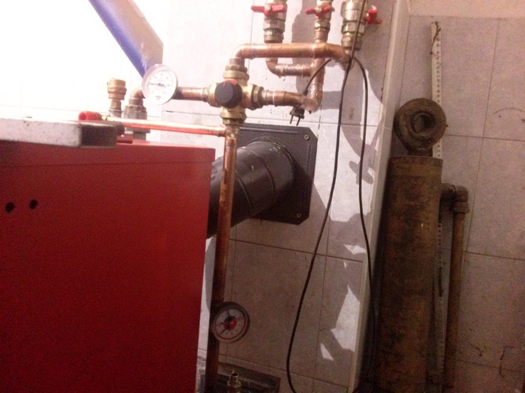 Evo slike kotla od 120 KW na pelet Radijator Kraljevo TKAN 120 . Kotao je udaljen od podstanice jedno 50 m. Cevi kroz zemlju su predizolovani sistem ø 88.9mm. Da skrenem paznju na cetvorokraki mesni ventil Caleffi od 2" koji je na ovoj slici levo i koji je kasnije "motorizovan". Kotao se u toku grejne sezone ne ne gasi, nego automatika odredjuje koliko ce mesni biti otvoren.