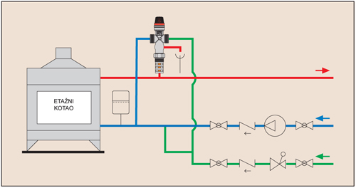 četvorokraki je ok , al bajpas ...ako je već pumpa namontirana na povratni vod , onda bi trebalo da stoji na levoj cevi (na slici) a ne na srednjoj ,tj na bajpasu a ne na povratnom vodu od radijatora