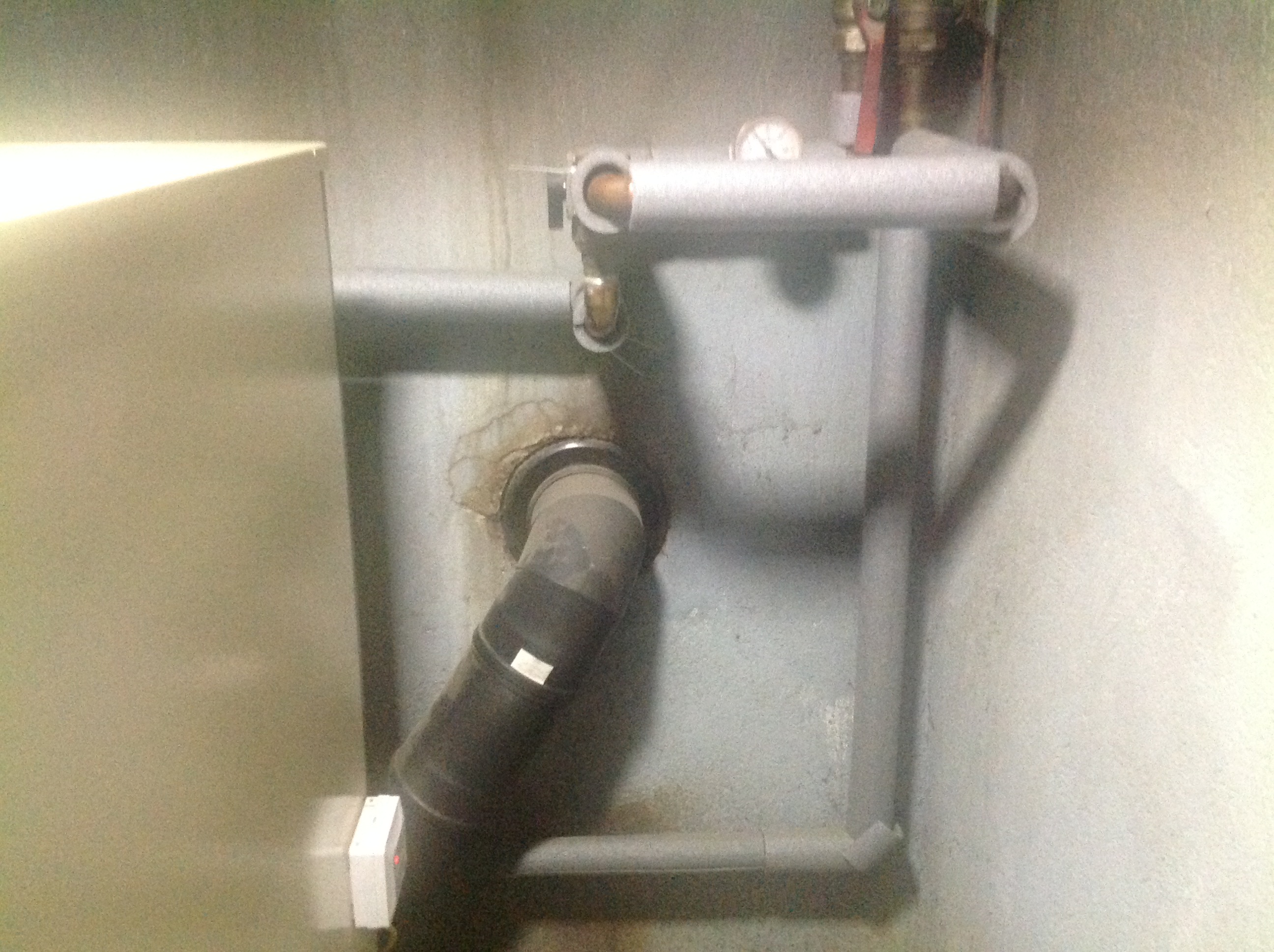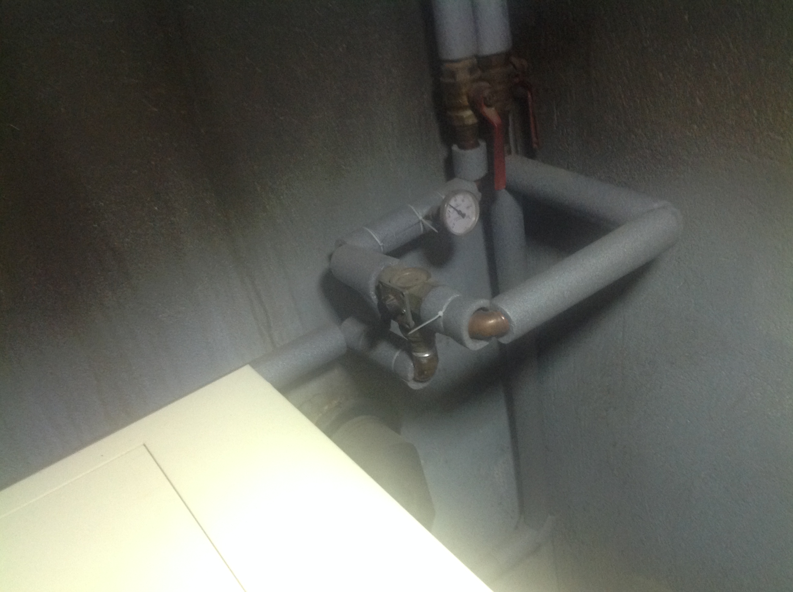 Takođe se nigde ne vidi ni jedan nepovratni ventil i može se pretpostaviti i da instalacija nije hidraulički ispravna. Osim toga ova pozicija ovakvog ventila nije dobra jer se okretanjem smanjuje protok ka radijatorima i ne dobija se dobra regulacija, smanjuje se grejanje ali ne i temperatura. Jednim trokrakim ventilom se ne može regulisati temperatura polaza i obezbediti zaštita kotla od kondenzacije, trebaju dva ako se žele obe regulacije, a to verovatno povlači potrebu za još jednom pumpom i hidrauličkom skretnicom, zavisi koliki je potršački deo i kako je izveden. Ovde pored kotla ima mesta da se uz relativno malo radova sve postavi kako treba da bude.