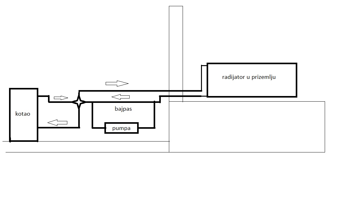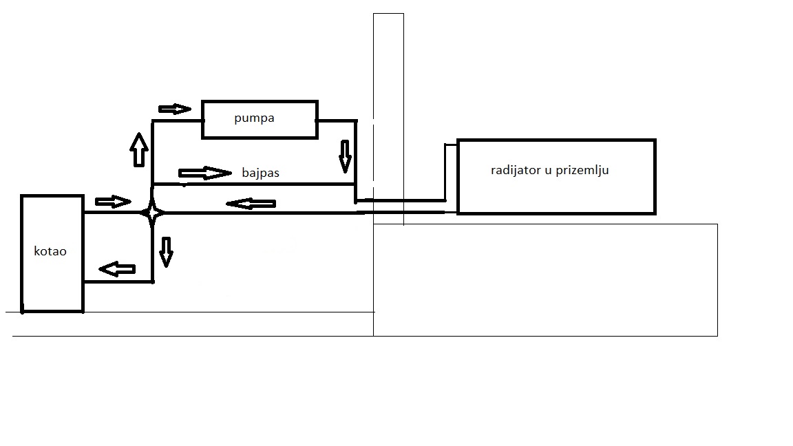 Na drugim crtežu sam malo preterao sa visinom pumpe. Svakako bi bila vislja od gornje cevi u sustemu ali bi bila niža od visine radijatora u prizemlju. Imam radijatore i na spratu kao i prikačen bojler na sistem. Par postova ranije sam okačio sliku tog bojlera. Ovo kažem ako menja situaciju tj. vas odgovor.