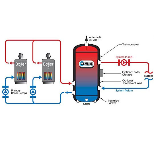 Kod kotlova moze i trokraki. Ili dva ili jedan zajednicki na sabirniku i razdelniku od kotlova. Pumpa ka akumulatoru i to je to.