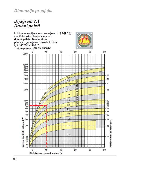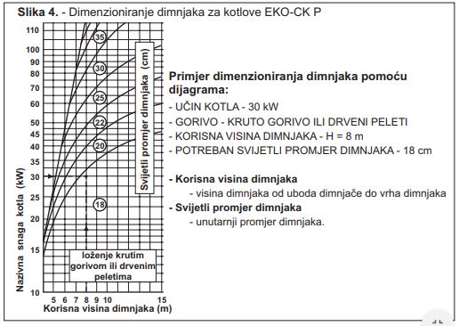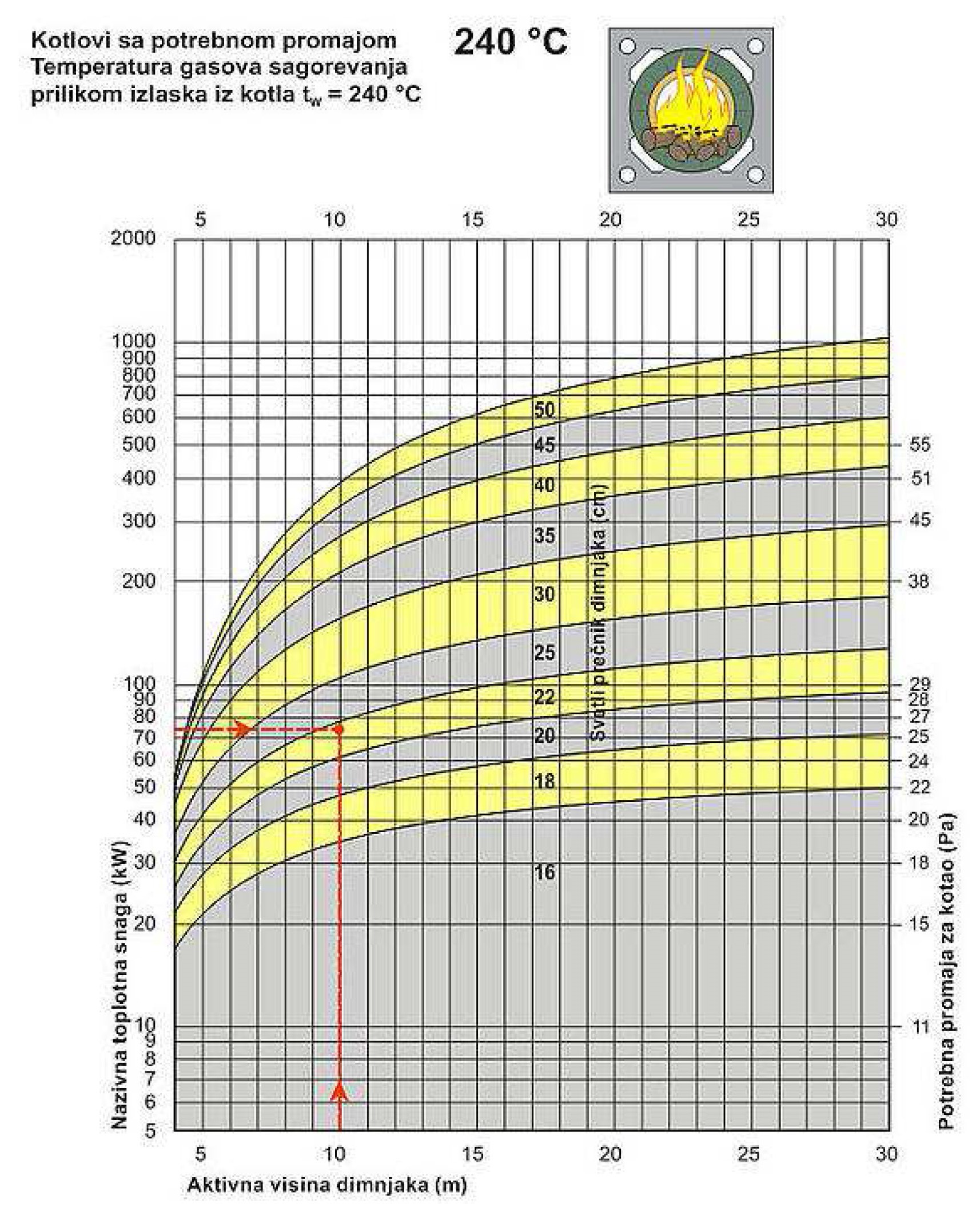 Postoje tabele i dijagrami, treba ih dobro pregledati i pronaći se u njima - Prema navedenim podacima (visina krova cca. 8 m i snaga kotla 30 kW) za drvo, ugalj, brikete i pelet određuje se prečnik na 160-180 mm. Sa preciznim i detaljnim podacima biće moguće i precizno određenje - npr. udaljenost od prepreka, uobičajeni vetrovi, nadmorska visina i drugo.