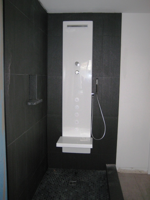 taj isti vodoinstalater nikako nije mogao da nadje sredinu za cevi i slavine u nasem ensuite kupatilu, eno ga taj zid izresetan k'o da je sastavljan iz komada! i sad poslednji put je nesto pomerao, jao meni, jao meni!