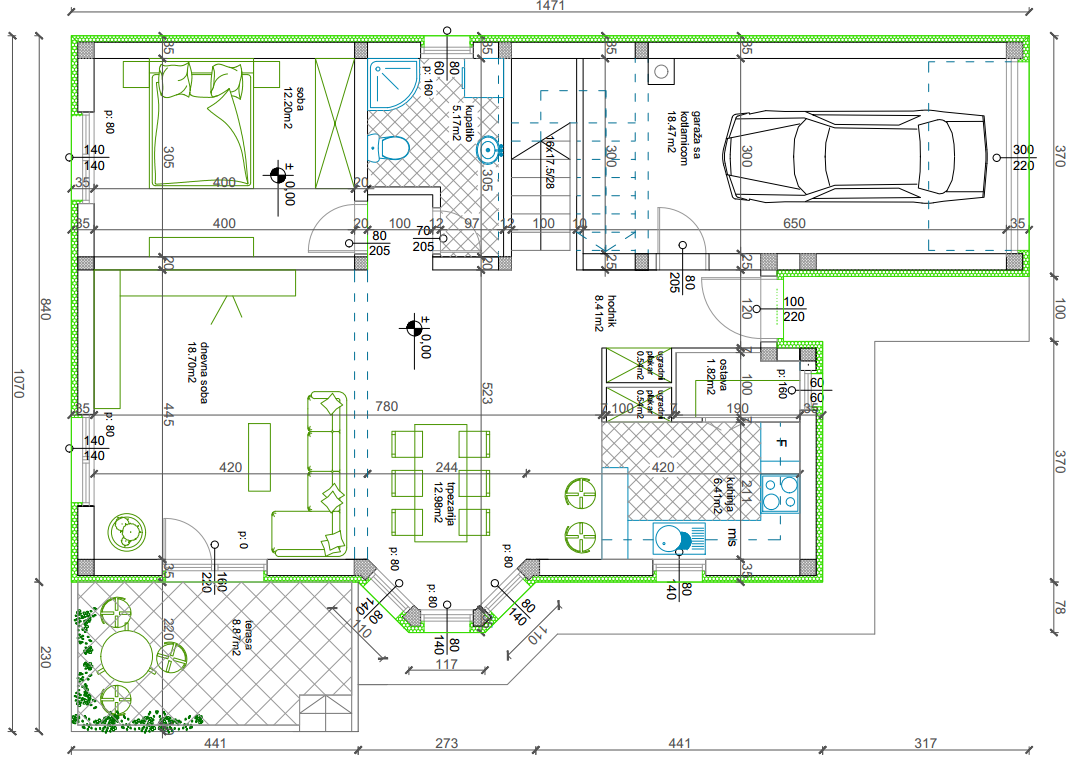 Ona tri prozora u trpezariji bih stavio da idu skoro do poda. (volim svetlije prostorije, stvar ukusa)