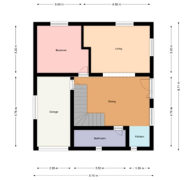 u pravcu fert gredica. Taj raspon je 3.2m (iznutra). Poprecno u osnosu na fert i S-zid je raspon 7.5m (duzina preko dnevne i obicne sobe iznutra, to je ujedno raspon ka spoljnim zidovima).