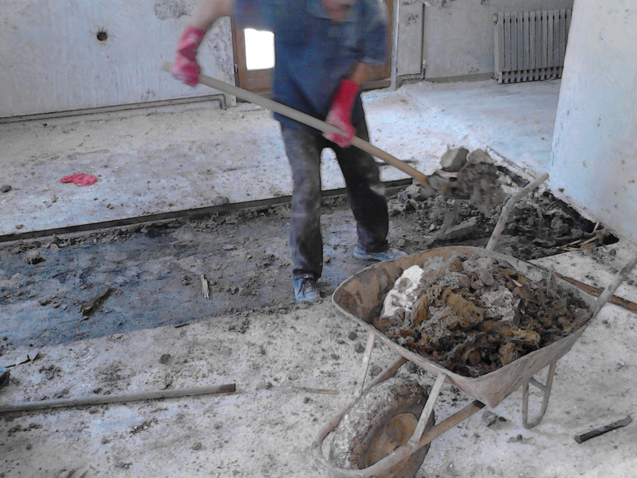 Iz kuće sve pobacano, ostali samo goli zidovi. Polupao sam ravnajuće slojeve jer se ispod njih nalazila kamena vuna. Za sada smo sastrugali sve slojeve sa zidova do maltera i sve detaljno dezinfikovali...