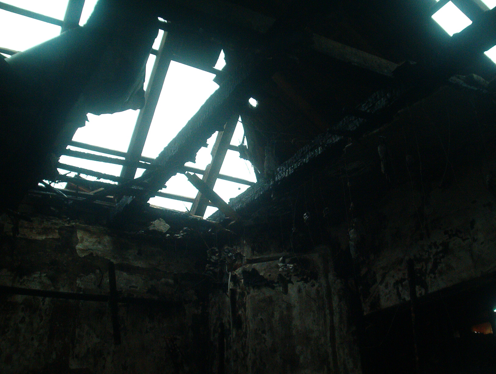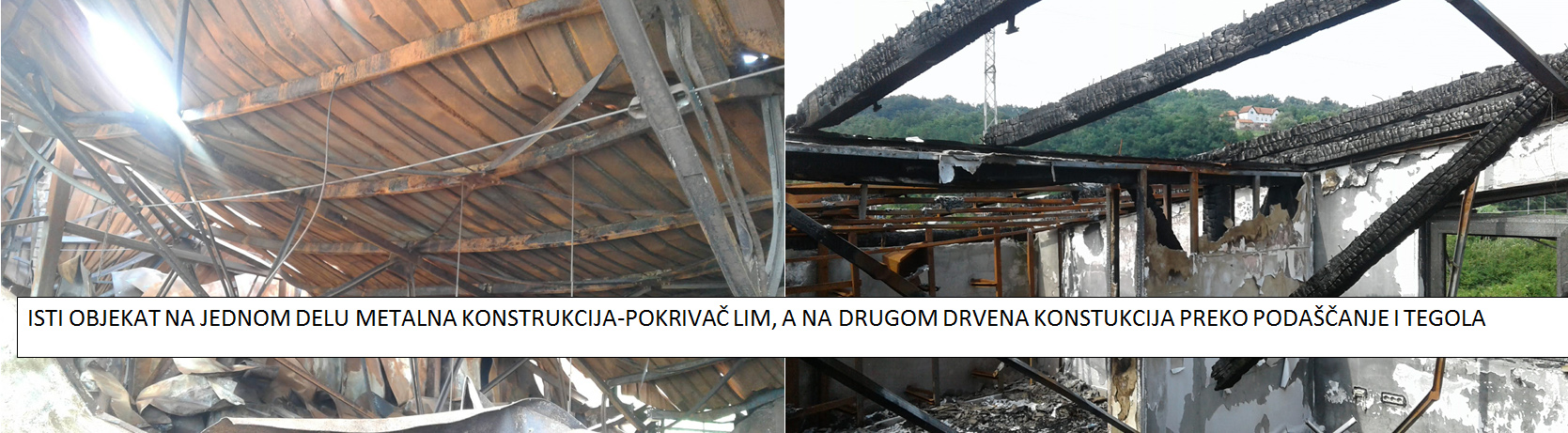 Evo slike jednog objekta koji je na delu skladišta i proizvodnje imao metalnu konstrukciju i pokrivač od TR lima a nad upravnim delom zgrade je bila drvena krovna konstrukcija. Manje više rezultat isti. Šteta totalna. jedina je razlika što je metalni krov pao zato što je goreo uskladišteni repromaterijal a drveni krov što se sam zapalio...