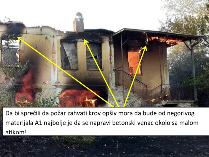 2. Završni obod fasade objekata mora imati horizontalni pojas (koliko se sećam minimum 1.0m visine) od materijala A1 klase reakcije na požar. Mada ovo ima smisla kod visokih zgrada i stirenskih T.I. U slučaju vikendice koja je niska i verovatno nema termoizolaciju veća je verovatnoća da će je zahvatiti spoljašnji požar (kada gori okolno rastinje a ne sama unutrašnjoost vikendice) i podhvatiće "krov" spolja. Sledeće oko prozora i vrata na poslednjoj etaži morao bi biti negorivi pojas sa svih strana minimum 0.5m. Opet i ova odredba ima smisla kada objekat ima termoizolaciju koja je od gorivog materijala i kada je objekat visok a kada nema gorivu T.I. onda je najbolje da objekat ima "kaplamu" venac od betona. Najbolje bi bilo kada bi na kraju venca imali i malu atiku a da je oluk sakriven i da je ležeći. Ovo da se uradi na postojećem objektu je potpuno neracionalno ali ima smisla na novoprojektovanim objektima.
