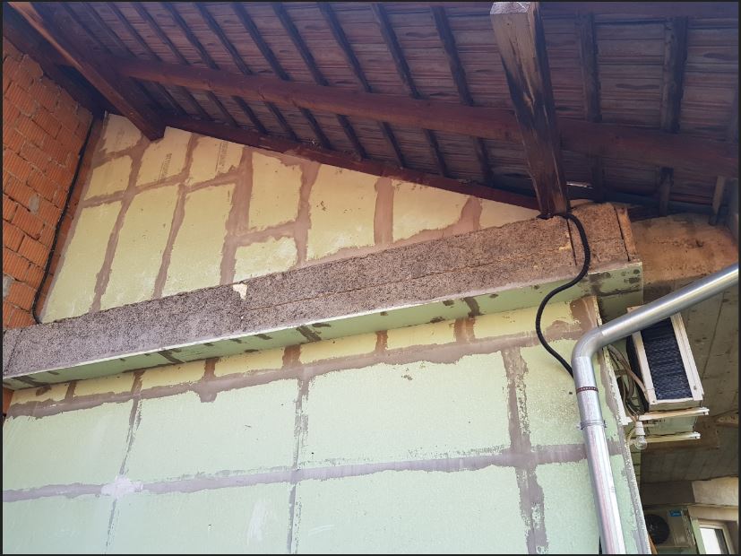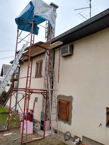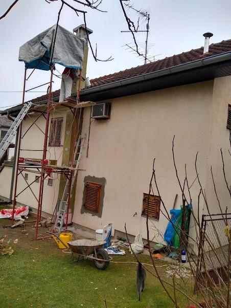 Pre par meseci ozidao sam novi dimnjak uz spoljni zid objekta i zaštita spoljne izolacije od kamene vune je morala da se izvede. Ako bi se postavio lepak+mrežica samo na dimnjaku javio bi se kasnije problem hladnog mosta kada se bude radila izolacija čitavog objekta. Zalepio sam table stiropora do dimnjaka (uspravno okrenute-znači pogrešno) malom količinom lepka i taj stiropor je zaštićen samo jednim lepka ali bez mrežice. Na dimnjaku preko kamene vune je stavljen prvo impregnacioni sloj lepka a zatim redovan sloj lepka sa mrežicom. Da bi se izolacija na tom objektu izvela onako kako treba moraće da se uradi dosta pripremnih radova pre izvođenja same izolacije - izolacija stirodurom ispod nivoa tla, sva stolarija mora da se izmesti u ravan sadašnje fasade (na slikama se vidi da je jedan prozor već izmešten), postojeća prskana fasada mora da se ukloni do maltera, prepravka krova ... ono što svi izbegavaju; u pitanju je objekat iz 1986 kada se nije razmišljalo o energetskoj efikasnosti a i mnogim drugim stvarima. Tako da kasnije (verujem, nadam se, pretpostavljama i spremam se) u toku ove godine treba da se uradi izolacija kompletnog objekta: ukloniće se postavljene table stiropora a preko dimnjaka će se postaviti još jedan sloj mrežice i dva sloja lepka. Evo malo i slika kako bi bilo sve jasnije.