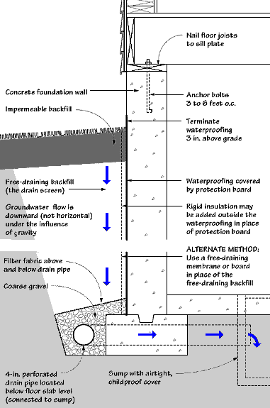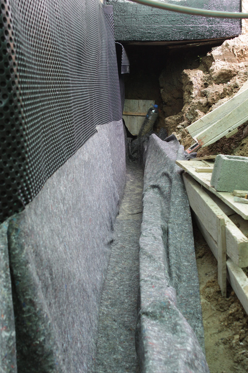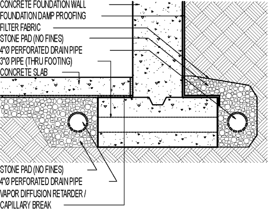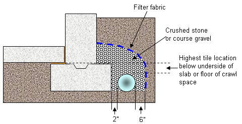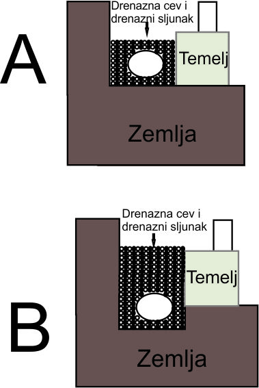 samo A . Vazno je da cev bude ispod betonske ploce .u slucaju B bi moglo da dovede do spustanja temelja. Evo nekoliko slika. U svim slucajevima je postavljena propusna tkanina/filter izmedju zemlje I drenaznog kamena radi sprecavanja ulaska zemlje u kamen. Neznam dali kod nas ima u prodaji filter/tkanina koja se navlaci na cevi, ako ima I to bi bilo pametno dodati.