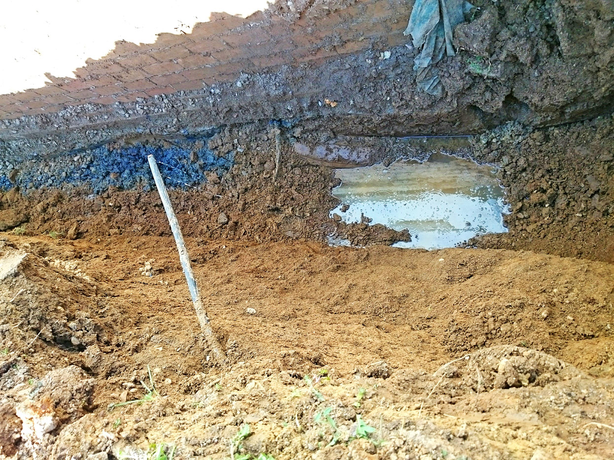 Ako je moja predpostavka tačna , vi ćete morati da sanirate hidroizolaciju , a to podrazumeva rušenje zaštintnog zida od cigle i pristup već postavljenoj HI . Ceo ovaj postupak ima smisla samo ukoliko je objekat hidroizolavan sa svih strana tj i od tla i od bočnog zemljišta . Najčešća greška kod izvodjenja HI sa bitumenskim proizvodima je kvaliteta izvedenih radova .