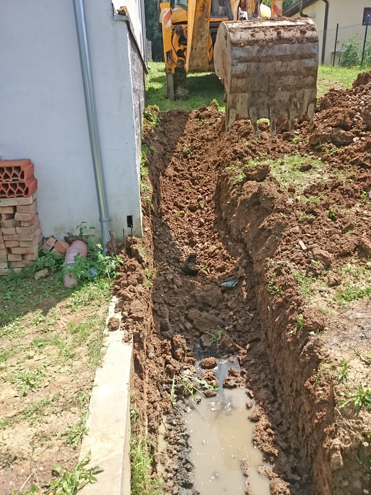 Kao da si izvideo situaciju, cev je na kraju bila samo polozena u zemlju, i jesenas pozovem masinu da kopa i kazem pocni odavde (tamo gde je polozen kraj drenazne cevi) i pici na gore, prva, druga kasika, treca kad je krenula voda stade covek mislio da je pokidao neku cev... Ako se ne varam drenazna cev je fi 150 voda je izbijala iz cevi sigurno 2-3min. Rekoh resio sam problem, uradicu drenazne jame i to je to, ostavio tako preko zime otkopano, resio sam se "potocica" na bocnoj strani ali mi sa prednje strane pravi problem....
