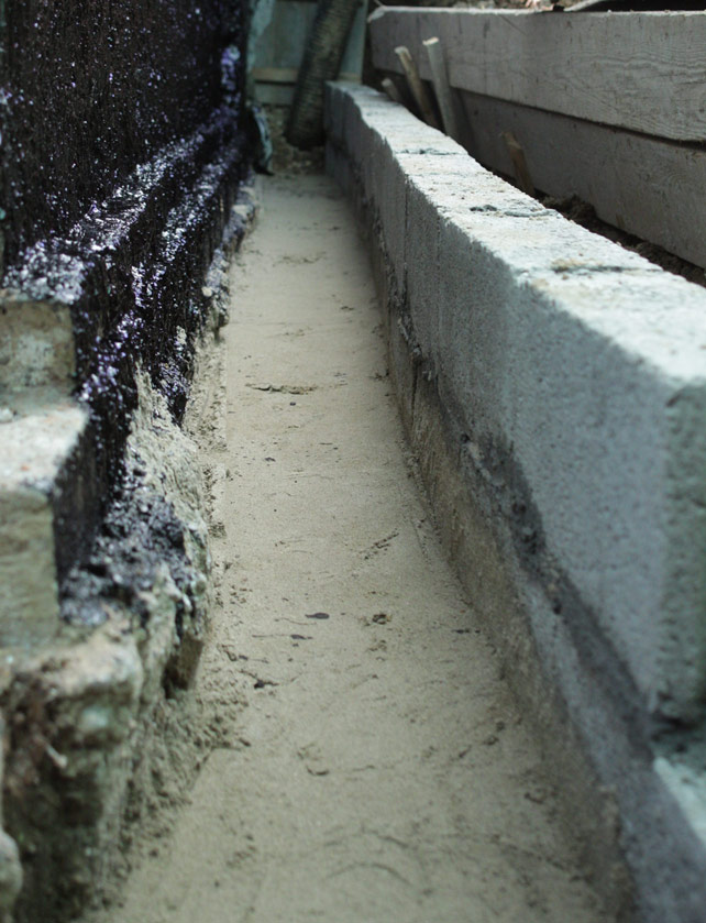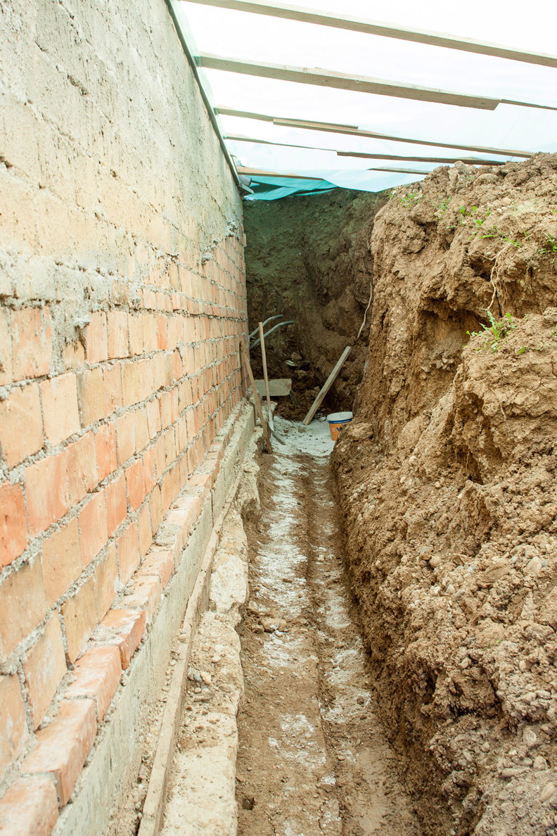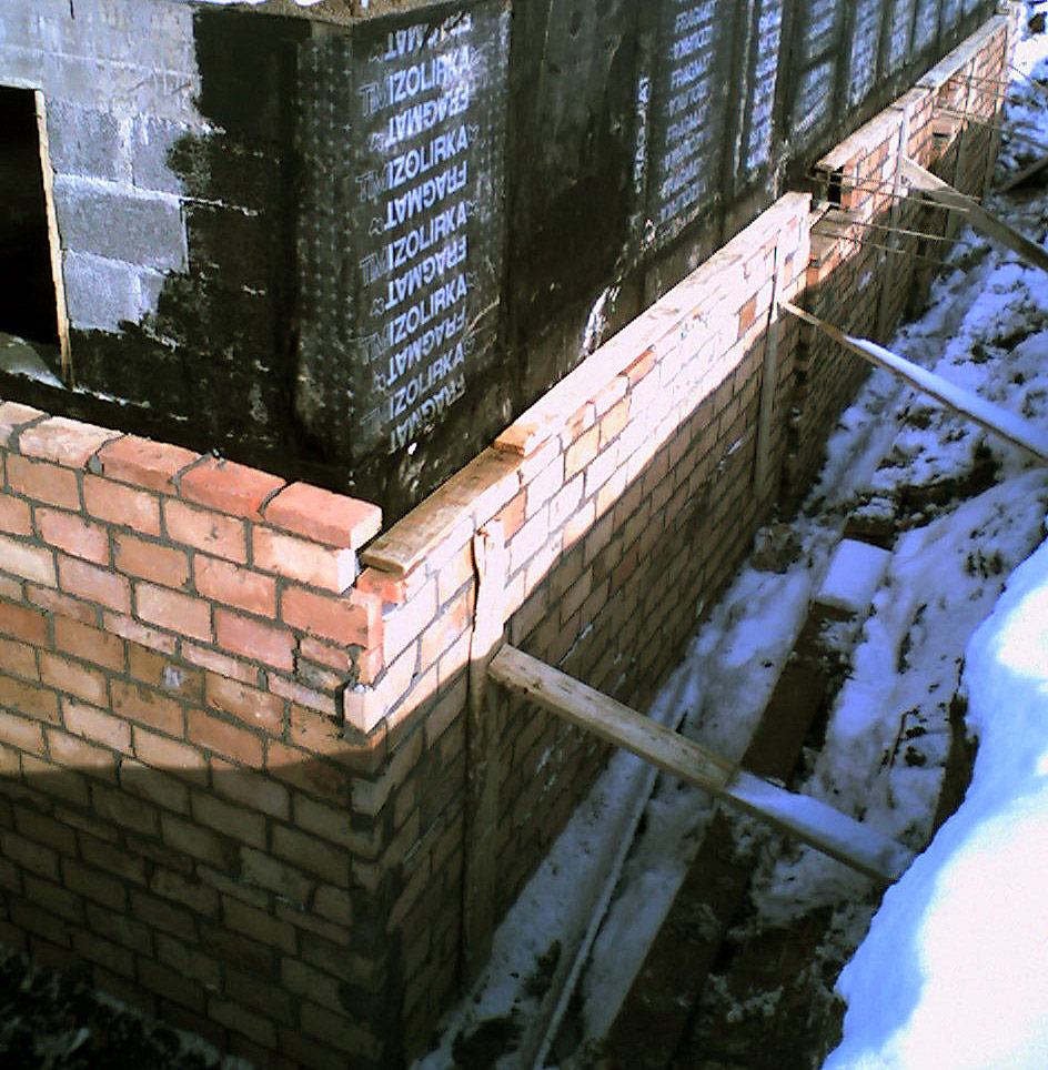 Kada se zidalo uradjen je presek izmedju mrtve ploce i zidova, zidano je beton blokom koji je sa spoljne strane presvucen kondorom onda je ostavljen razmak i podignut je jos jedan zid od cigle na koji naleze zemlja...