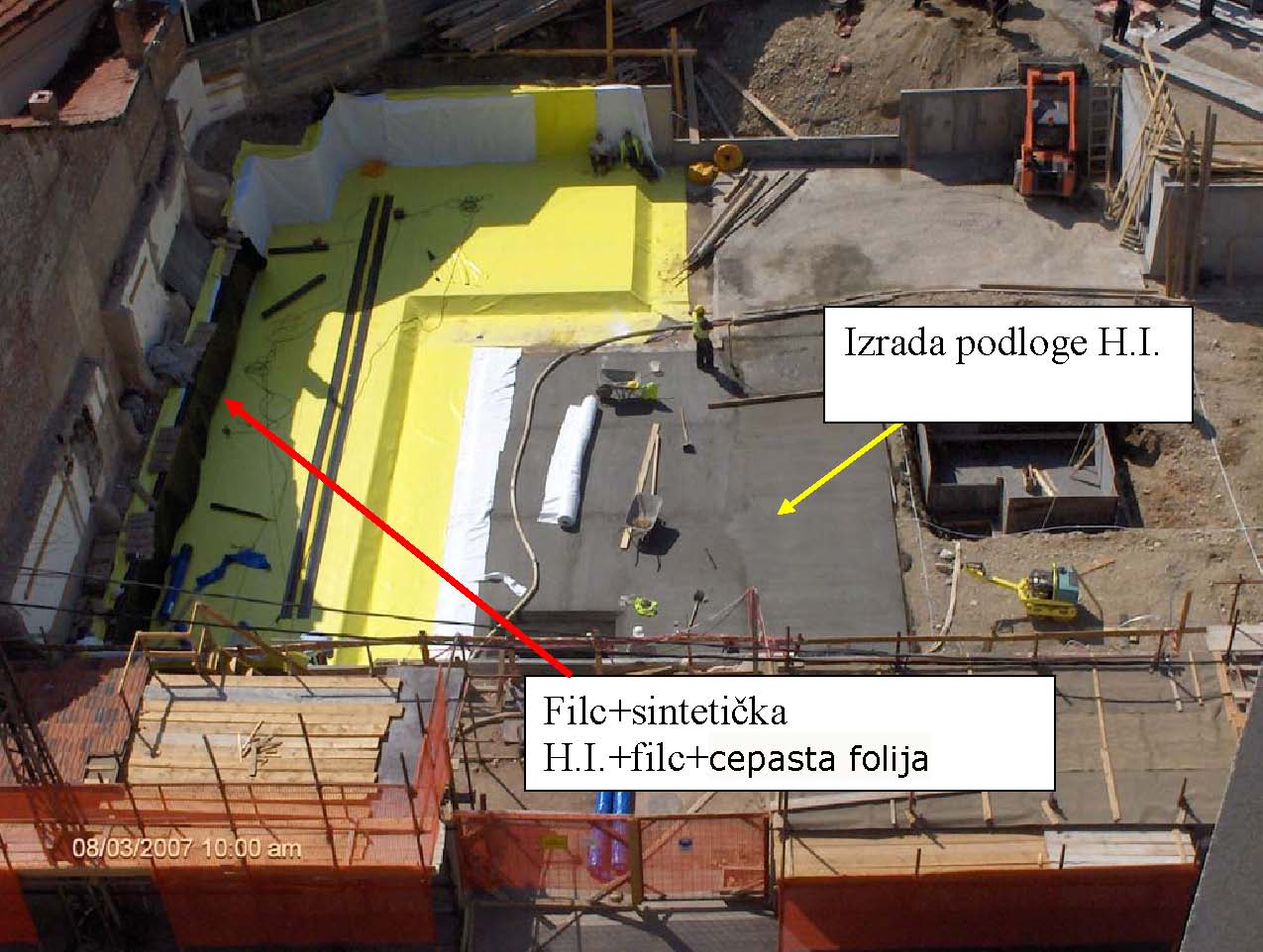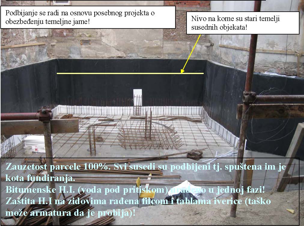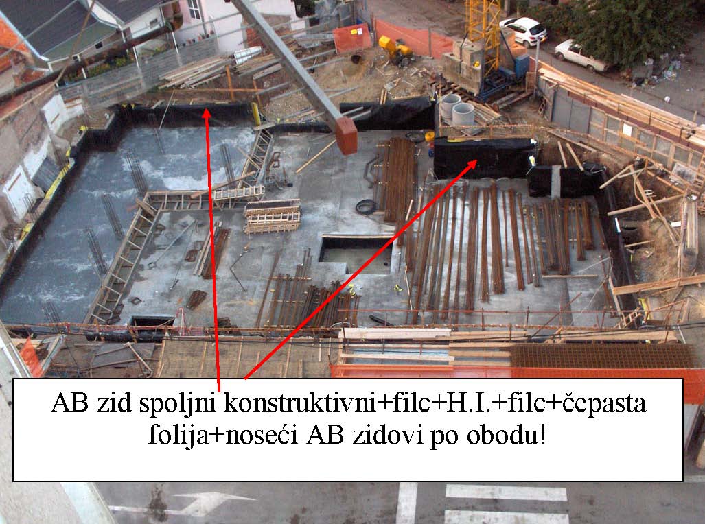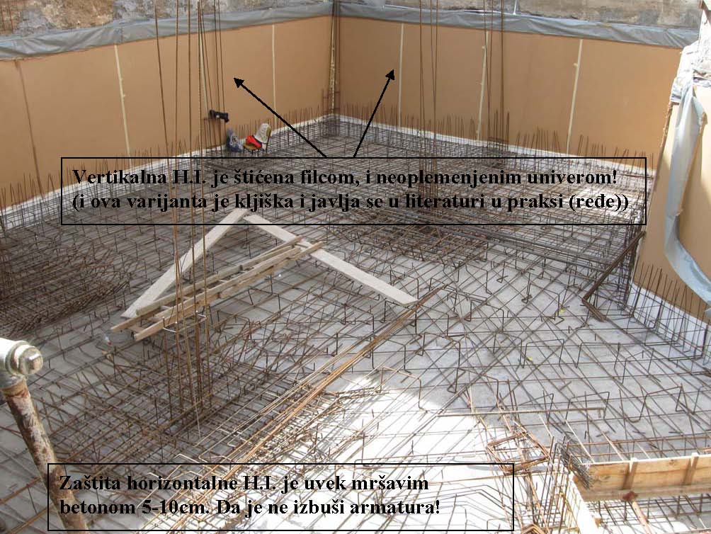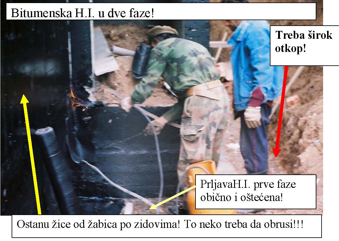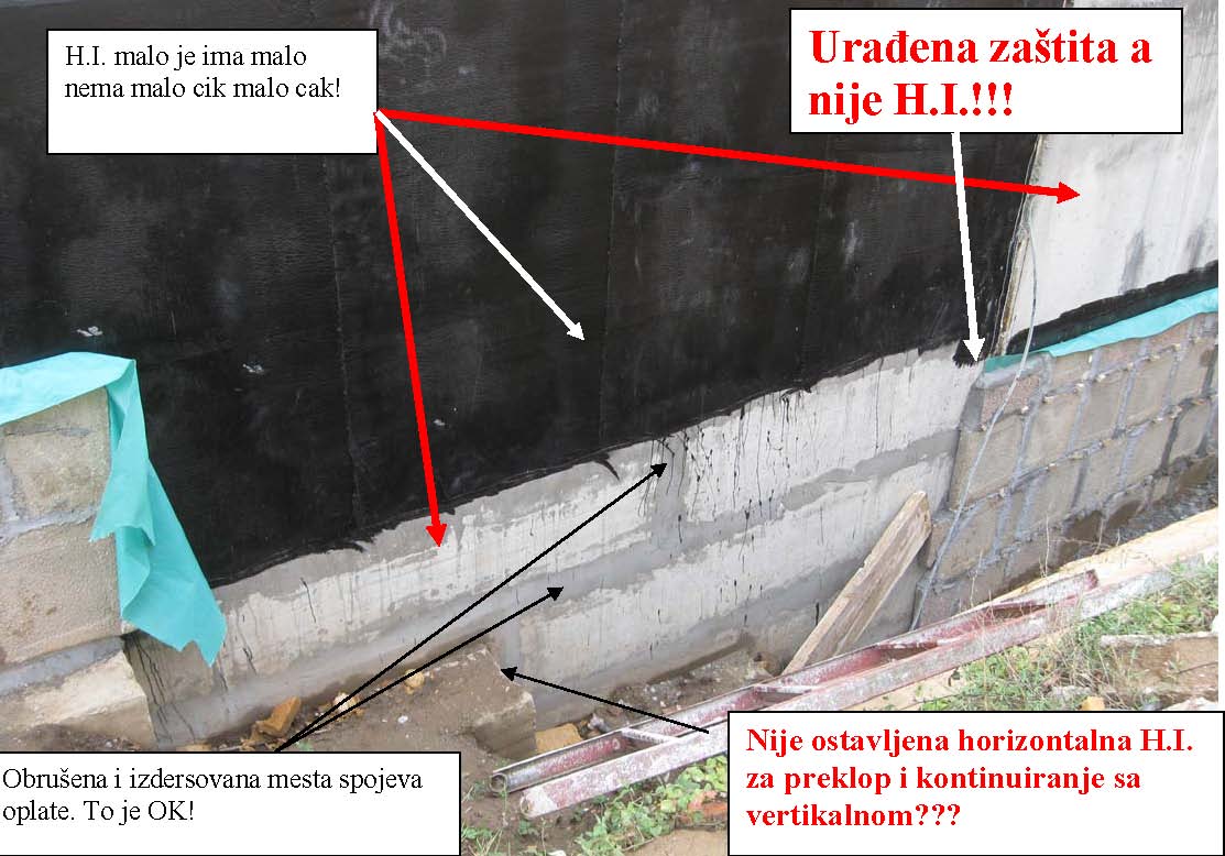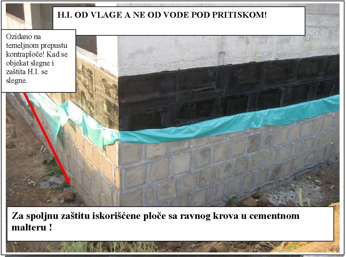 Objekat je prizeman. Temelj je iznad visine poda oko 30cm, omalterisan je, na podu je kondor kao i na horizontalnoj HI zida. Vertikalna HI temelja/zida do visine od 30cm ne postoji. Jednostavno- horizontalna HI poda i horizontalna HI zida nisu spojene vertikalnom HI. Samo postojećim malterom.